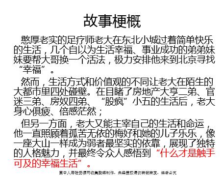 从老大的幸福寻找幸福 ——献给永盛家人 什么是幸福? 看过了吗? 剧情主旨 该剧旨在探讨当下人的幸福观,嬉笑怒骂,皆有深意,让观众在亦庄亦谐的家庭情感故事中审视现实社会的奇怪现状,反思急功近利的浮躁心态,用一个小人物的“无为之事”和“不言之教”诠释最朴实、最纯粹的幸福观。 故事梗概 憨厚老实的足疗师老大在东北小城过着简单快乐的生活,几个自以为生活幸福、事业成功的弟弟妹妹要帮大哥换一个活法,极力安排他来到北京寻找“幸福”。 然而,生活方式和价值观的不同让老大在陌生的大都市里四处碰壁。在目睹了房地产大亨二弟、官迷三弟、房奴四弟、“股疯”小五的生活后,老大身心俱疲、倍感茫然; 但另一方面,老大又能主宰自己的生活和命运,他一直照顾着孤苦无依的梅好和她的儿子乐乐,像一座大山一样成为弱者最坚实的依靠,展现了独特的人格魅力,并最终令众人感悟到“什么才是触手可及的幸福生活”。 老大的幸福 二弟傅吉安是傅家的主心骨,是傅氏家族最成功的人,但实际上却是个内心十分脆弱、打肿脸充胖子的人,过着表面光鲜的上层生活。因早年遭遇前妻背叛而对感情心灰意冷,视金钱为最真实的东西。他与出身模特的明月保持着有名无实的契约婚姻关系,虚荣与张扬为其最大秉性,所有的事都是硬撑着,有真情却装无情,后因资金链断裂而破产,在明月和老大的帮助下,走出了困境,回归了家庭;