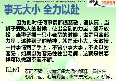 把小事做到极致你就成功 佛学中有句话非常好: “狮子搏物”, 狮子是百兽之王,狮子何以会是百兽之王? 因为他对任何事情都很恭敬,很认真,当狮子要吃人的时候,使出全副的力量,绝不放松,当狮子抓一只小老鼠的时候,也是用全部力量,这种狮子的精神,就是无小大,无敢慢,一件事情到了手上,不管小事大事,不要以为容易,如果以为容易往往出毛病,这就是说怎样可以做到泰而不骄。 泰而不骄:按南怀瑾大师的解释,是指在 态度方面、心境方面,胸襟要宽大,不骄傲。 【注释】 把小事做到极致你就成功 世界上最成功的人, 永远不是那些智慧最高、 计谋百出的人, 而是那些凡事全力以赴、 追求一百分的人。 把小事做到极致你就成功 这种人有以下三个特点: 第一,做得比精还要精 俗话说得好:“艺无止境。”我们学习知识、技能,有时好像已经精通了,跟更高的境界比起来,其实还远远不够。只有以过去的基础为起点,不断向更高处攀登,才有可能超越大众,达到杰出的水准。 一般人总是达不到老师的要求,孔子所达到却远远超出老师对他的要求。这就是平庸者与成功者的差别。平庸者浅尝辄止,成功者精益求精,两者所达到的境界自然有天壤之别。 把小事做到极致你就成功 第二,做得比好还要好。