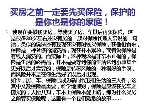 成人达己 成己达人 如今的80后们总被人说成是追求潮流与叛逆的一代。其实在这些年轻人心中,除了崇尚时髦与个性,他们更加强调享受高品质的生活并十分在意自己的身体健康状况。 相信保险的人跟着国寿走, 不相信保险的人被风险拖着走. “疗伤歌手”阿桑因乳腺癌在台湾 去世。对于这一噩耗,只有觉得生命的脆弱和美人易香消损,除了能够为阿桑追加一点点思忆,我们做不了别的事情。《叶子》、《寂寞在唱歌》等等都是阿桑的成名之作,而如今,这位被号称歌坛男版阿杜的女明星就这样离开了我们,寂寞时不会再唱歌了。 本年2月20日,女星潘星谊因为在家中不慎跌倒撞上鱼缸,医治无效最终身亡,年仅29岁。才9岁呀,太年轻太年轻 了。实在是没办法多说什么,意外是谁也无法预料到的,有人说,如果不养鱼,家里没有鱼缸,那就什么事情也没有了。但,谁又能会料到,美丽的潘星谊就如此的凋零,枯萎。 潘星谊:年仅29岁 一叶零落 仲春难掩凉意寒入骨 歌声常萦 虽走犹在此生不寂寞 年轻人更要买保险 对于现在刚刚毕业的年轻人来说,绝大部分人都是独生子女,且正处于事业和人生的上升期,一旦遭到意外情况突发不幸事件或重大疾病,将对家庭和财产造成不可估量的严重影响,因此年轻人更需要用保险来保障自己的健康与家庭的稳固。 一些带储蓄功能的保障型保险产品,其风险保费计算会随着年龄的上升而增加,所以买保险一定在年轻时尽早打算。 意外险(寿险)→健康险(含重大疾病、医疗险)→教育险→养老险→分红险投连险、万能险 年轻人的买险顺序 小张是位27岁的年轻白领,刚刚参加工作三年,在大学学的金融专业,毕业后在银行工作,手上有一些积蓄。2004年初,一位进入保险公司做业务的大学同学找到小张,并向小张推荐了其所在公司的两种热卖保险产品,一种健康险和一种分红险,小张的关注点放在了那款分红险上了,小张的想法很简单:我还年轻,身体好的很;那款分红险确实不错,于是花了四五千元买了一份分红险,而没有买健康险。 2004年夏天,小张一段时间感到腹部很不舒服,去医院检查被告知肾上有一块阴影,被医生建议去肿瘤医疗检查,后被确诊为肾癌。这对年轻的他及他并不宽裕的家庭是个巨大的打击!这时他想起了曾买的一份保险,可是一翻起保单他后悔不迭:买的是分红险而不是重大疾病险…… 年轻更要买保险,买的是一份责任和对未来科学的规划! 年轻人买保险买的其实就是一份责任。也许现在的年轻人,对于责任还考虑得很少,不过,生活总会慢慢教会他们。 买房之前一定要先买保险,保护的是你也是你的家庭! 案例分析 1995年10月2日,洛桑醉酒驾车,由于车速过快,撞入停在路中正在修理的大卡车之中,因伤势太重,迅即身亡,年仅27岁。 洛桑的师傅博林回忆说:事发当晚,洛桑和父母一起吃饭,非常开心。走时,洛桑把手机留给了父母。在路上,不停地有传呼找他,而路边没有电话可以回,他开的可能有些着急。另外,刚演出回来,他也比较疲惫……在洛桑定居北京后,他将远在西藏的父母接到了北京,刚开始是租房,到后来条件稍好后又贷款买了房,直至出事前,他的贷款才刚还几年。在洛桑出事后,他的父母在承受痛失爱子的同时,还承受了被迫回乡的痛苦。因为洛桑出意外后,房贷无法还了,两位老人又没有任何经济来源,银行将房子收了回去。 对不同的人,用不同的方法,那是一种 睿智。 我们不是卖保险的,我们是提供保险服务的。 21世纪是网络泛滥的时代,是短信,是QQ,是MSN,是E-MAIL的时代,学会用这些随时随地的传递保险知识。 善用电脑,用PPT,Flash等动画传递利益演算等知识,声音与动画比一张纸更直接。 怎样给年轻人推销保险