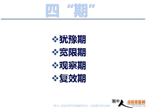 业务员必知四“期” 四“期” 犹豫期 宽限期 观察期 复效期 犹豫期 时间: 10天 宽限期 时间: 60天