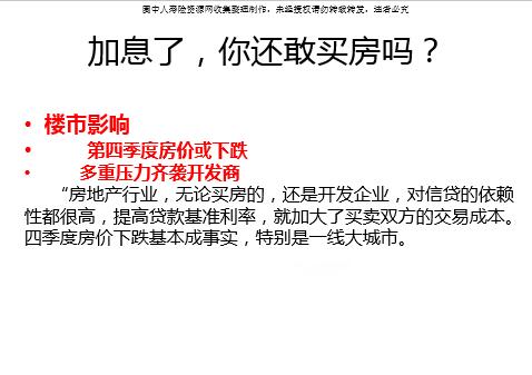 贷款 存款 时间:2002.2.21-2010.10.19 看一看,存1万,利息增加多少钱? 首要原因——抑制通货膨胀。今年2月起,一起处于负利率。 加息次因——推动地产调控,剑指地产高价。 第三原因——G20峰会。本周末,在韩国首尔举行。此时主动加息,对国内是调控的需要,对国外也是争取主动权的需要! 为什么要加息? 市民影响 1 1万元5年定存利息多300元 8月CPI:3.5% 加息后,一年息:2.5% 负利率:1.0 存1万,暗亏100元 未来预测: 货币政策重大转折 中国应进加息通道 昨日,著名经济学家韩志国指出,货币政策出现重大转折,中国应该进入加息通道。银河证券首席经济学家左小蕾表示,加息将影响房地产行业的投资,而且提高0.25个百分点不足以降低价格水平,她预测未来还将连续加息。 银行业人士则认为此次加息“还是存在一定争议的”,毕竟加息后,海外投机的热钱将加速流入国内,人民币升值的预期也将更加强烈。 加息了,你还敢买房吗? 楼市影响 第四季度房价或下跌 多重压力齐袭开发商 “房地产行业,无论买房的,还是开发企业,对信贷的依赖性都很高,提高贷款基准利率,就加大了买卖双方的交易成本。四季度房价下跌基本成事实,特别是一线大城市。 专家:楼市前景不太乐观 楼市前景不太乐观,“肯定会导致观望氛围加重。”韩世同表示。他还认为,加息对楼市的打击远远要低于因经济形势不好而造成的恐慌。 外资:热钱可能涌入:不过,虽然加息加重了国内买卖双方的经济负担,但最开心的是外资。“在人民币不断升值的行情下,境外资金进入楼市,不仅可获得汇率差,还可获得房价上涨的收益,更能获得货币加息带来的好处,这对外资来讲,是三重利好。”韩世同指出。 房产开发商:实力较弱者或“关门” 有房企表示,虽然加息不是仅仅针对房地产行业,但开发商已经感觉到,多重压力将集中来袭。 “这次很悬了,正常融资被封锁,企业重组要听国土部意见,限购令已经让市场成交大幅下降,现在又加息,不仅财务成本增加,市场销售回笼肯定也受影响。”东莞某开发商一负责人告诉记者。在他看来,部分实力较弱的开发商面临“关门”的可能性较大。“即使大型开发商,各种压力也将集中来袭。” 开发商今年以来的新开工项目多数资金需要自己掏腰包。 加息,保险影响有多少?