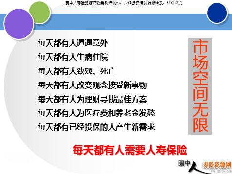从事什么工作实际上并不重要 重要的是对于这个工作的态度 什么是你工作的原动力? 父母? 子女? 自己? 我到底要什么? 我实际上能做什么? 我为什么做? 一个人这辈子可能犯的最大的错误就是:以为他或她在为别人做事。 你总会找到你工作的理由! 寿险工作—快乐无处不在 我们相对自由地安排自己的展业时间,这是一种快乐; 我们可以有选择地结识一些新朋友、新客户,这也是一种快乐; 我们可以尽情的畅想自己的收入,进而鼓励自己去实现这一目标,这还是一种快乐; 。。。。。。 在工作中享受生活你会快乐工作 在追求中激励自我你会工作快乐 有付出,不一定有回报。 没有付出,一定没有回报! 我们拥有的条件 优秀的产品 优秀的公司 优秀的城市 优秀的伙伴 每天都有人遭遇意外 每天都有人生病住院 每天都有人致残、死亡 每天都有人改变观念接受新事物 每天都有人为理财寻找最佳方案 每天都有人为医疗费和养老金发愁 每天都有已经投保的人产生新需求 每天都有人需要人寿保险 市场空间无限 今天很残酷,明天更残酷,后天很美好,但绝大部分人是死在明天晚上,看不到后天的太阳。—— 马云 你不去面对总有人去面对 你不发展总有人去发展 你不做总有人去做 公司 年首年度佣金明示表 您在哪里呢? 截止目前 (2010年*月*日) 您又在哪里? 作为一个瘸子,不敢太偷懒了,真的。 否则,以后瘸的就不光是腿了。