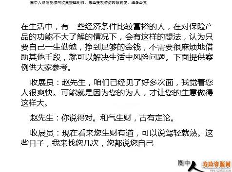 保险有多重要 我不认为保险有多重要, 只要有钱什么问题都可以解决 在生活中,有一些经济条件比较富裕的人,在对保险产品的功能不大了解的情况下,会有这样的想法,认为只要自己一生勤勉,挣到足够的金钱,不需要很麻烦地借助其他手段,就可以解决生活中风险问题。下面提供案例供大家参考。 收展员:赵先生,咱们已经见了好多次面,我觉着您人很爽快。可能就是因为您的为人,才让您的生意做得这样大。 赵先生:你说得对。和气生财,古有定论。 收展员:现在看来您生财有道,可以说驾轻就熟。这些日子,我来找您几次,您都说您自己 完全有这个实力处理生活中风险,而我试图从我的专业角度建议您接受保险理财的办法。可是您一直没有给我说明我的观点的机会。 赵先生:不是不给你机会。而是我觉得一来太麻烦,我文化水平不高,怕是听不懂那么多术语;二来把足够的钱放在身边,遇到问题随时可以拿来用,保险还需要办那么多手续,然后把钱放在保险公司很多年,我心里不塌实。 收展员:赵先生,现在社会分工越来越细,谁也不可能什么都清楚。您对保险不熟悉完全正常,正因为如此,才给了我尽朋友