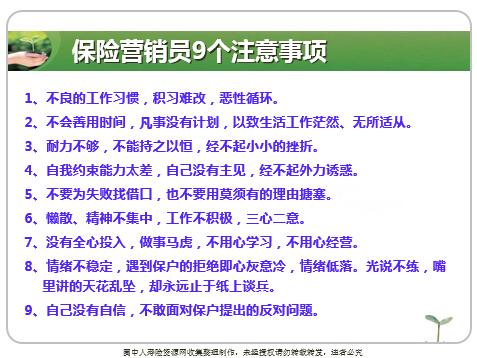 成功主管 经营“心法” 序言 许多保险代理人在寿险营销的生涯中会遭遇发展的瓶颈,这往往是自我管理没有做好,作为团队的主管,一定要了解情况,提供协助。在日常的营销过程中,保险营销员会在不经意中犯下一些细节性的错误,团队主管只有经过细心了解,才能对症下药,协助其解决问题、帮助其发展。并且在日常的辅导中,主管对营销员的协助也将会对其产生重大的影响(尤其是营销员的第一任主管)。因此,作为一名优秀的主管对营销员的辅导训练要扎实谨慎,辅导与追踪到位;做好典范的同时提升自我的管理能力,也会使属员的技能得较快提高。 目录 保险营销员自我管理9原则 1、言以律己 宽以待人 对待自己要严谨,对待别人要宽厚,宁愿人负我,也不愿我负人。同时,不要和没有保险理念的人一般见识。 2、有容乃大 为人度量一定要大,心胸开阔,不要与 人斤斤计较。俗称“宰相肚里能撑船” “吃亏是福”。 保险营销员自我管理9原则 3、维持良好而和谐的人际关系 特别是与同一职场的同事关系,彼此间可以相互关照、相互协助、一切要以和为贵。 4、不要为失败找借口 “失败是成功之母”从失败中积累经验,从哪里跌倒的从哪里爬起来。切误一味地为失败找借口,怨天尤人,而不去检讨自己的行为,这种心态是绝对不会成功的。 保险营销员自我管理9原则 5、保持积极、乐观、进取的心态 用积极、乐观、进取的人生观面对生活,让每一天过得更充实,生活过得更有意义,人生自然是彩色的。 6、遭遇挫折,绝不怀忧丧志 许多人一遇到挫折就丧失信心,不敢面对现实,这不是正确的观念,人生遇到挫折是一件极其平常的事,因此,当挫折降临时,更要鼓起勇气、擦干眼泪、勇敢的站起来。