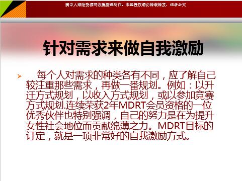 调整状态 自我激励 忆往昔,岁月峥嵘…… 看看我们走过的每一步,在走的一刹那,我们以为会从此跌倒,生活不总是一帆风顺,也不总是风平浪静,有时我们会碰到很多困难! 当我们遇到困境时, 我们会怎样呢? 我们扭转心态,我们调整目标,我们自我激励。 我们总会走过艰险, 迎来新的希望! 寻找方法 激励自我 订出宣示性的目标 有位伙伴有个外号叫「杨20」,因为他经常逢人就说出FYP 20万的目标,无形中,每个人都会关心他的目标达成与否,他也把这些关心当作每天激励自己的方式。因此,建议每位保险行销伙伴,都应大胆说出目标! 针对需求来做自我激励 每个人对需求的种类各有不同,应了解自己较注重那些需求,再做一番规划。例如:以升迁方式规划,以收入方式规划,或以参加竞赛方式规划.连续荣获2年MDRT会员资格的一位优秀伙伴也特别强调,自己的努力是在为提升女性社会地位而贡献绵薄之力。MDRT目标的订定,就是一项非常好的自我激励方式。 回想当初进入保险业的动机 当初踏入保险业时,相信每个人都是充满信心、满怀希望,如果碰到挫折时,不妨回想当初的雄心壮志及规划,信心可能很快就找回来了! 多参加研习营、进修会、培训会