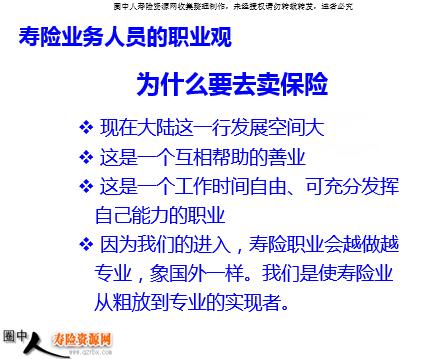 保险诚信 寿险业务人员的角色与职责 前言 最大诚信原则是保险的基本原则,保险合同是最大诚信合同。 少数业务人员不诚信行为导致严重后果,老百姓对业务人员和保险公司甚至整个行业缺乏信任。 寿险业务人员的角色和职责要求我们必须以诚信为本。 诚则成,信则恒! 学习目标 帮助业务人员树立正确的职业观,正确定位,遵守职业道德,履行职责,按照寿险职业规范进行寿险销售工作。 课程大纲 一、寿险业务人员的职业观 二、合众业务人员的职业定位 三、合众业务人员的职业道德 四、合众业务人员的职业角色 五、合众业务人员的工作职责 六、合众业务人员的展业规范 课程大纲 一、寿险业务人员的职业观 二、合众业务人员的职业定位 三、合众业务人员的职业道德 四、合众业务人员的职业角色 五、合众业务人员的工作职责 六、合众业务人员的展业规范 保险公司能不能开店等客户上门买? 如何看待客户的拒绝? 如何看待保费? 如何理解寿险业务员职业 寿险业务人员的职业观 人生风险无处不在,但人性却常常漠视它的危害;寿险商品本身是一种非魅力产品,客户购买的其实是保险公司的信誉及业务人员的专业服务;寿险商品更是一种非常复杂的金融商品,因此,人们对寿险的不理解也可想而知,接受寿险理念也需要一个过程。 寿险业务员职业观(一) 寿险业务人员的职业观 寿险是事业,而不仅仅是一份工作;寿险业务员是寿险制度的传道士,而不是单纯求利的生意人。寿险是善业,寿险代理人是孜孜不倦的救助弱势群体的人道主义工作者,他们的心中充满着对众生的慈悲。 寿险业务员职业观(二) 寿险业务人员的职业观 我们的工作是:启迪人们对人生风险的认识,督促并合理地规划好客户的责任准备金,传播科学的寿险互助制度,而不是为了保费的多少而销售。 寿险业务员职业观(三) 寿险业务人员的职业观 每天做客户访问,宣传寿险本身就是功德无量的事业、是关爱众生的事业。它使我们心中充满了对生活的希望和直面困难的勇气。我们坚信,通过我们的努力,会使每个人在未来都拥有自己的保障;我们每个人也会最终成为一名对社会作出贡献的人,一名自信而成功的人。