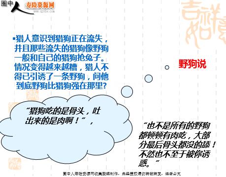 你不知道我们两个跑的目的是完全不同的! 我仅仅为了一顿饭而跑,而他却是为了性命而跑呀! 一只牧羊在旁讥笑说 需求决定目标 猎人想:猎狗说的对啊,那我要想得到更多的猎物,得想个好法子 。 猎人又买来几条猎狗, 凡是能够在打猎中捉到兔子的, 就可以得到几根骨头,捉不到的就没有饭吃.。 这一招果然有用,猎狗们纷纷去努力追兔子,因为谁都不愿意看着别人有骨头吃,自已没的吃 。