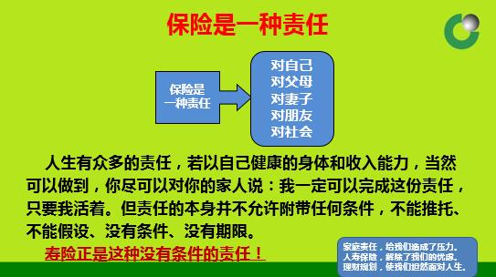 理念篇 保险的意义 在于今日作明日的准备。 明智的您就让保险 为您承担风险、奉献爱心、责任和尊严…… 一个有责任感的人对父母、妻子、儿女真爱的表现,乃在他对这个温馨、幸福的家庭有万全的准备,保持适当的寿险,是一种道德责任,也是国民该负起的义务。 ——罗斯福(美国前总统) 什么是保险? 为什么一定要有保险规划? 保险能解决什么问题? 保险理财有什么用? 一生平安 事业有成 子 寿 财 人的一生有三怕! 1、一怕活得太久: 长命百岁是美好的愿望,但是就算一生平安顺利,没有病痛,也总会面临年老退休的问题,日益增长的生活费用如何保证一生衣食无忧?“养儿防老”不是不变的承诺,安享晚年是权利,更是个人尊严的体现。买保险并不是为了要死,而是为了要有尊严的生活下去。如果购买养老保险,那么活得越久领得越多,可以让保险成为您领养的一个孝顺儿子。 2、二怕死得太早: 如果一个家庭的经济支柱在一个不适当的时候,不幸地离开这个世界,他的家庭和家人会因此陷入失去亲人的无尽痛苦与失去依靠的困窘之中。那他们往后的生活该怎么办呢?既然我们很爱自己的家人,但我们无法永远陪伴他(她)们,一旦我们走了,我们应该留下一些有用的东西给他(她)们,而不是一堆难题和负担。人寿保险可以帮助被保险人家庭建立一个健全的财务计划,确保被保险人遭受意外时家庭的经济保持安定。购买保险足以体现出一个人对自己家庭和家人的关爱和责任感。