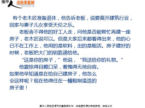 营销故事会 有个老木匠准备退休,他告诉老板,说要离开建筑行业,回家与妻子儿女享受天伦之乐。 老板舍不得他的好工人走,问他是否能帮忙再建一座房子,老木匠说可以。但是大家后来都看得出来,他的心已不在工作上,他用的是软料,出的是粗活。房子建好的时候,老板把大门的钥匙递给他。 “这是你的房子,”他说,“我送给你的礼物。” 他震惊得目瞪口呆,羞愧得无地自容。 如果他早知道是在给自己建房子,他怎么 会这样呢?现在他得住在一幢粗制滥造的 房子里! 我们又何尝不是这样。我们漫不经心地“建造”自己的生活,不是积极行动,而是消极应付,凡事不肯精益求精,在关键时刻不能尽最大努力。等我们惊觉自己的处境,早已深困在自己建造的“房子”里了! 不如把自己当成那个木匠,想想我们的房子,每天我们敲进去一颗钉,加上去一块板,或者竖起一面墙,用我们的智慧好好建造!因为生活是我们一生唯一的创造,不能抹平重建,即使只有一天可活,那一天也要活得优美、高贵,墙上的铭牌上写着:“生活是自己创造的。” 什么是目标? 要想成功,那要有一个明确、清晰、实际可行的理想——那就是目标。 目标是激发人们行为的预期要求达到的目的和结果,也就是我们在未来一定时期内工作所期望达成的结果。 人生的目标无处不在 精神目标 财务目标 成长目标 家庭目标 目标的设定 -短期目标 -中期目标 -长期目标 达成目标的必须条件: 坚强的意志力 自信 永不服输的精神 计划工作、工作计划 父子两住山上,每天都要赶牛车下山卖柴。老父较有经验,坐镇驾车,山路崎岖,弯道特多,儿子眼神较好,总是在要转弯时提醒道:“爹,转弯啦!” 有一次父亲因病没有下山,儿子一人驾车。到了弯道,牛怎么也不肯转弯,儿子用尽各种方法,下车又推又拉,用青草诱之,牛一动不动。 到底是怎么回事?儿子百思不得其解。最后只有一个办法了,他左右看看无人,贴近牛的耳朵大声叫道:“爹,转弯啦!” 牛应声而动。 牛用条件反射的方式活着,而人则以习惯生活。一个成功的人晓得如何培养好的习惯来代替坏的习惯,当好的习惯积累多了,自然会有一个好的人生。