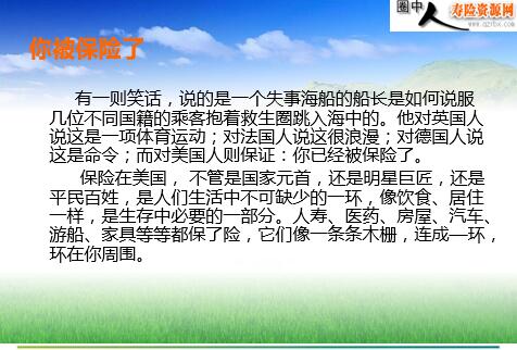 保险杂谈 你被保险了 有一则笑话,说的是一个失事海船的船长是如何说服几位不同国籍的乘客抱着救生圈跳入海中的。他对英国人说这是一项体育运动;对法国人说这很浪漫;对德国人说这是命令;而对美国人则保证:你已经被保险了。 保险在美国, 不管是国家元首,还是明星巨匠,还是平民百姓,是人们生活中不可缺少的一环,像饮食、居住一样,是生存中必要的一部分。人寿、医药、房屋、汽车、游船、家具等等都保了险,它们像一条条木栅,连成—环,环在你周围。 千分之三的游戏 某兵营流行这样一种游戏:上级军官每年一次召集部下1000人,发给每人一把手枪,并告诉他们:这1000把手枪中只有3把枪有真的子弹,要求他们每人朝自己的脑袋上开一枪,剩下的人可以在余下的一年里无忧无虑的生活...... 游戏进行着,每年一次...... 朋友,如果你是其中的一员,你敢吗? 你敢朝自己的脑袋上开一枪吗?每年都开一次? 其实在生活中,我们所有人都在无意识地每年重复着这样的游戏:根据中国人生命表统计显示,中国人的年平均死亡率是千分之三! 有人说千分之三的概率很小,因为1000人之中才只有3人。 有人说这个概率很大,因为对个人来说,只有两种可能:生或死。因此,个人的概率是50%。 朋友,你认为呢? 既然这是一个逃不了的游戏,我们为什么不及早做准备呢? 狮子与老鼠 一只狮子躺在树下打盹,一只老鼠过来问:"大王,您需要我帮忙吗?"狮子斜视着老鼠说:"呵呵,真好笑,快滚开!" 过了几天,狮子中了猎人的圈套,被绳索吊在树上,正当它痛哭不已时,老鼠跑过来,用牙齿咬断那些绳索,让狮子获得了自由。 [启示]:一只小老鼠给强大的狮子以自由,有时一点小小的投资也会给我们带来一生的幸福。 蚂蚁与蚱蜢 秋近尾声,蚂蚁辛勤地寻找食物储藏。蚱蜢先生在一旁笑它们傻。 “现在才秋天,冬天还很远呐!”蚱蜢先生说。“就快到了,所以我们要赶快准备。”蚂蚁一边说,一边满头大汗的搬运食物。 这一年的冬天忽然在一场大雪中提前来临了。蚂蚁们在温暖快乐的气氛中享用丰盛的美食。 那位潇洒的蚱蜢先生却在寒冷的天气里饿死了。 [启示]:有储藏才有寒冬的美食,保险,今天预备明天,是真稳健,选择保险,拥有轻松,潇洒的明天。 石头与钻石 三个骑士在风高月黑的沙漠中行走,忽然听到一个神秘的声音,让他们每人捡起一些石头装入口袋中,三个骑士很不情愿地装了几块石头在袋中。那个声音又说:“明天太阳升起的时候,你们会又喜又悲”。天刚亮,他们拿出石头,发现全是罕见的钻石。骑士真的又喜又悲。 [启示]:其实,很多人在领取保险金的时候,和骑士们的心情一样,后悔当初没多抓几块石头(其实是钻石),保险亦然,到用时才知它的可贵,后悔当初……。如新编诗:生命诚可贵,保险价也高;若为家庭故,两者皆可要。 自己建造的房子 有个老木匠准备退休,他告诉老板,说要离开建筑行业,回家与妻子儿女享受天伦之乐。 老板舍不得他的好工人走,问他是否能帮忙再建一座房子,老木匠说可以。但是大家后来都看得出来,他的心已不在工作上,他用的是软料,出的是粗活。房子建好的时候,老板把大门的钥匙递给他。 “这是你的房子,”他说,“我送给你的礼物。”