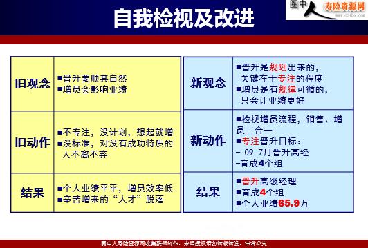 组织发展 —— 把握3个关键,做好一件事 关键1: 专注晋升目标 如何做到销售、组织齐头并进 06、07年的困惑 不清楚如何拟定目标,有做老板的念头, 没有持续的行动 为什么千辛万苦寻来的“人才”还是脱落? 做增员需要耗费大量时间、精力,要坚持吗? 曾经的困惑 2008年7月份分公司晋升表彰会 看到身边同事的晋升,重燃最初的梦想 2008年第五期TOP2000 组织发展关键:不在于曾付出多少激情和努力,而在于长期专注 突破的动因 自我检视及改进 专注晋升目标,不仅组织发展好,个人业绩也很好 晋升就是个人业绩+增员,这是一件事 收获成长 关键2: 销售+增员=1件事 如何做到销售、组织齐头并进 完整1件事的好处 工作更高效,销售、增员都基于对保险的认同,都以需求为出发点 长、短期目标兼顾 专业技能不断提升 销售+增员=1件事(1/4) 面谈前准备 面谈对象:准客户、原同事 面谈心态:取得客户认同,并激发行业兴趣 面谈技能: “三讲” 、 “二五增员法” 面谈工具:工资条、基本法手册 销售+增员=1件事(2/4) 客户拒绝时切入增员逻辑 销售+增员=1件事(3/4) 导入二五增员法:赞美、高估、怀疑、关心、帮助 【客 户】产品是不错,可是资金有困难 【业务员】你的企业一直都经营的这么好,怎么会资金困难?(激发不满) 【客 户】你是不知道,现在行业不景气,竞争激烈… 【业务员】那也是,我很多客户也这么讲,生意是越来越难做…(建立同理心) 你看我在保险业,从来不担心这些问题…(三讲、工资条、启发需求) 【实例】职业:个体经营者 身份:准客户