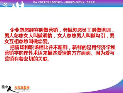 营销如爱的N个定律 ——从情感角度看营销专题三 企业忽悠顾客叫做营销,老板忽悠员工叫做培训,男人忽悠女人叫做调情,女人忽悠男人叫做勾引,男女互相忽悠叫做恋爱。 把情场和职场相比并不新鲜,新鲜的是用经济学和营销学的理性术语来描述爱情的方方面面。因为爱与营销有着密切的关联。 营销如爱的N个定律 ——未婚篇 【NO1】相处不适合及早分手, 这叫市场转移。 【NO2】多交普通意义上的男性朋 友,这叫潜在消费者积累。 【NO3】生活相处前,少用脑子判 断,这叫消费者画像。 【NO4】遇到黑白马王子,不要轻易 中断联系,这叫目标客户锁定。 【NO5】女追男不是糗事,这叫市 场攻势。 【NO6】要知道对方还有几个女孩 同时喜欢,这叫竞争形势掌握。 【NO7】对锁定同一目标的女孩身 份要有了解,这叫定位分析。 【NO8】不要停留于了解男方收入.职务.年纪.长相,还要深入了解 对方性格喜好,这叫消费者洞察。 【NO9】根据对方喜好,适当的改 变自己,这叫关键点营销。 【NO10】在同一类型男人处失败几 次,需深刻自省,这叫重新定位。 【NO11】勿与太烂男士交往,坚 持品位,这叫不做低端品牌。 【NO12】为避免满盘皆输,尽早 几中择一,这叫专做细分市场。