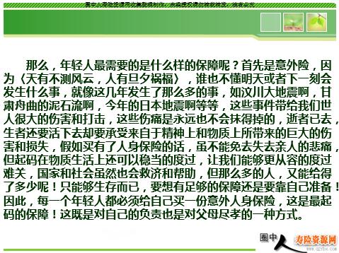 现在很多的80、90后的年轻人一跟他们说到保险,他们大多数人都会说:“我很年轻,不需要保险”或说“我很健康,不需要保险”,其实,保险是今日作明日的准备,在我们需要的时候才想到要买就不一定买得到了,在没需要时就要准备好,这样才来得及将风险带给我们的伤害降到最低。 那么,年轻人最需要的是什么样的保障呢?首先是意外险,因为〈天有不测风云,人有旦夕祸福〉,谁也不懂明天或者下一刻会发生什么事,就像这几年发生了那么多的事,如汶川大地震啊,甘肃舟曲的泥石流啊,今年的日本地震啊等等,这些事件带给我们世人很大的伤害和打击,这些伤痛是永远也不会抹得掉的,逝者已去,生者还要活下去却要承受来自于精神上和物质上所带来的巨大的伤害和损失,假如买有了人身保险的话,虽不能免去失去亲人的悲痛,但起码在物质生活上还可以稳当的度过,让我们能够更从容的度过难关,国家和社会虽然也会救济和帮助,但那么多的人,又能给得了多少呢!只能够生存而已,要想有足够的保障还是要靠自己准备!因此,每一个年轻人都必须给自己买一份意外人身保险,这是最起码的保障!这既是对自己的负责也是对父母尽孝的一种方式。 我们不妨认真想想看,假如我们万一发生了什么风险,要是没有买保险的话,那我们的父母是不是增加了很大的负担,要是我们有了保险,那么虽然免不了父母精神上的伤痛,但在经济上就不至于那么紧张了,大大的减轻了父母的压力和负担,这样不是更好吗?