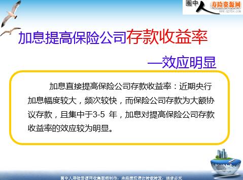 课程大纲 一、央行加息政策及原因 二、加息对保险行业的影响 1、保险公司资产配置情况 2、加息提高保险公司存款收益率 3、加息提高保险公司长债收益率 4、加息有利于公司和客户 三、加息对保险股的影响 四、保障型保险人人需要 五、分红险走俏市场 六、总结 通货膨胀压力加大 负利率加剧 顺应市场利率变化趋势 课程大纲 一、央行加息政策及原因 二、加息对保险行业的影响 1、保险公司资产配置情况 2、加息提高保险公司存款收益率 3、加息提高保险公司长债收益率 4、加息有利于公司和客户 三、加息对保险股的影响 四、保障型保险人人需要 五、分红险走俏市场 六、总结 央行加息,对于保险, 有哪些积极影响? 保险公司资产配置情况: 《保险法》要求、国家监管机构要求,和保险产品所面临的偿付性的特点,都决定了保险投资要以安全和稳健为最基础出发点,即以银行协议存款和债券投资为主,这些投资占到保险公司总资产配置的75%以上。 加息提高保险公司存款收益率 —效应明显 加息直接提高保险公司存款收益率:近期央行加息幅度较大,频次较快,而保险公司存款为大额协议存款,且集中于3-5 年,加息对提高保险公司存款收益率的效应较为明显。 加息提高保险公司长债收益率 寿险公司债券主要配置于长期债券,且保险公司的债券投资大部分持有到期,债券市场的长期债券收益率进一步走高,对保险公司债券收益率的提高形成良好预期,对保险公司显然更有利。 对保险公司 对投保客户 —重大利好 加息将较大幅提升保险公司再投资收益率,保险公司通过分红保险把利润的70%分给客户,加息的到来,无异等于给保险公司和投保客户送了份礼物。 课程大纲 一、央行加息政策及原因 二、加息对保险行业的影响 1、保险公司资产配置情况 2、加息提高保险公司存款收益率 3、加息提高保险公司长债收益率 4、加息有利于公司和客户 三、加息对保险股的影响 四、保障型保险人人需要 五、分红险走俏市场