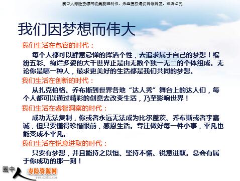 锐志人生 圆梦时刻 我们坚信,我们拥有一个共同的理想 本PPT参考文献----《锐》杂志 》 独一无二 世上没有两片相同的树叶, 无论何时,无论何地, 无论与谁,无论做什么, 这个世界上也只有一个你。 每个自己, 都是最值得珍惜的, 都是最有价值的。 人的一生当中要扮演很多角色, 但是无论你充当那种角色, 承担自己的只有你自己。 因此不论何时何地, 都不要忘记自己的价值, 昂首阔步走出你自己的人生。 凡人梦 电视选秀节目《英国达人》、《美国达人》已走红多年,而刚刚落下帷幕的《中国达人秀》,也掀起了一股不小的热潮。在这个舞台上,“草根”们尽情展示着自己的创意、勇气、快乐与执着,当然还有最重要的——梦想。不为名利,只为自己的心。“达人”并不是非“高精尖”不可,更是指对生活的小小追求、对自我的默默坚持,再平凡的身份,再普通的技能,都有可能造就“达人”,达人其实离我们并不远! 菜花甜妈的“今夜无人入眠”菜场版“送你葱”,街头艺人胡启志优雅的水晶球表演,只有一只手的钢琴手郑桂桂的阳光豁达。“耍牙妹”的辛酸坚忍,“口琴女””汤康敏、“闪电侠”卢驭龙等等,无不展示了普通人对梦想的坚持最求 梦想的舞台 人们以为最功利的电视节目,终于勇敢地给予了许许多多平凡却因梦想而伟大的人们…… 这里不再只是给青春、美貌、张扬的俊男美女, 而是还原到生活的底层,让我们看见梦有多大, 人就能依靠着梦走多远。 菜花甜妈 传奇式的人物。中国达人秀年度亚军,超人气女王,新神曲“送你葱”原唱者。拥有超高人气的她来自安徽农村,没有受过任何专业训练,26个英文字母也认不全,却能完美演绎英文歌曲,且音域宽广、高音稳定,还会演唱中国的民歌、地方戏等。她的音乐天赋极强,乐感和高音更是令人称奇:能演唱苏珊·波伊尔、玛丽亚·卡拉斯、伊莲·佩姬、珊地·派蒂、玛莉娅·凯丽,惠特尼·休斯顿,芭芭拉·史翠珊等巨星的经典歌曲,还能演绎黑人灵歌。她酷似香港富翁龚如心,又是菜市场之花,故被网友称为“菜花甜妈”、“中国版苏珊大妈”、“世界第一菜场天后”。 态度决定一切! 达人秀给人印象最深的并不是选手们高超的技艺,而是他们看待生活的态度。和我们身处同一个社会,许多选手的生活现状都远不如我们。但是他们的坚持、忍耐、勇气以及锐意进取的精神却令人久久不能忘怀。英国的苏珊大妈唱完不等评委发言转身就走,中国的鸭脖夫妻参赛完继续卖他们的鸭脖,无壁少年、残障达人展示的也不是残缺的肢体,而是永不放弃以及生命至美的震撼。他们只是来完成自己一个心愿、一个梦想而已。 看到他们,还有什么值得抱怨的呢?当达人们已经通过自身的行动去努力改善自己的生活,我们还在等什么呢? 我们因梦想而伟大 我们生活在包容的时代: 每个人都可以肆意忌惮的挥洒个性,去追求属于自己的梦想!缤纷五彩、绚烂多姿的大千世界正是由无数个独一无二的个体组成。无论你是哪一种人,最求更美好的生活都是我们共同的梦想。 我们生活在创新的时代: 从扎克伯格、乔布斯到世界各地“达人秀”舞台上的达人们,每个人都可以通过精彩的创意去改变生活,乃至影响世界! 我们生活在睿智洞察的时代: 成功无法复制,你或者永远无法成为比尔盖茨、乔布斯或者李嘉诚,但只要懂得珍惜眼前,感恩生活。专注做好每一件小事,平凡也能变成不平凡。 我们生活在锐意进取的时代: 只要有梦想,并且能持之以恒、坚持不懈、锐意进取。总会有属于你成功的那一刻!