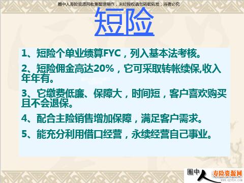 在大自然中,有一种昆虫,从春季到秋末,每在植物开花的季节,天天忙碌不息…… …它就是 蜜蜂 在蜜蜂种类中工蜂是最勤劳的,儿歌唱的“小蜜蜂,整天忙,采花蜜,酿蜜糖”,仅是指工蜂说的。 它们除采粉、酿蜜外,筑巢、饲喂幼虫、清洁环境、保卫蜂群等,也都是工蜂的任务。 是否很象我们的伙伴:除出单、增员外,培训、辅导新人、参与活动、不断拜访等,也都是我们的任务。 要酿出500克蜂蜜,工蜂需要来回飞行3万7千次去发现并采集花蜜,带回蜂房。 蜜蜂的翅膀每秒可扇动200至400次。飞行的最高时速是40公里。 要成就5000元的FYC,我们又需要面见多少次客户?又需要有多少位客户作为我们拜访的筛选对象呢? 一只蜜蜂酿吐一公斤的蜜,要用上三万三千三百三十三个工作小时,吮吸三千三百三十三朵花蕊。 一只蜜蜂毛茸茸的身体上能粘住5万至75万粒花粉。 要成就100,000元的保费,我们又需要面见多少次客户?又需要有多少位客户作为我们拜访的筛选对象呢? 借助5只复眼和3只单眼,蜜蜂的视角几乎可以达到360度。 一汤匙蜂蜜可以为蜜蜂环绕地球飞行一圈提供足够的能量。 借助五六联动热潮,伙伴你的业绩又将达到多少呢? 【解释】聚细沙成宝塔。原指儿童堆塔游戏。后比喻积少成多。 “不积跬步,无以至千里,不积小流,无以成江海”,积累每一粒沙,就有希望造就一座塔! 小小蜜蜂尚且知道“积累”的重要,我们作为一名保险从业人员, 更应该以加强活动量与积累更多客户量为己任。 小结 只有加大活动量,才有可能积累到大量客户 只有大量客户源,才有可能借助资源平台获得成功的机会 如何经营我们自己的 底薪? 短险是 我们永续经营的底薪; 主险是 我们永续经营的奖金。 短险能为您带来 什么 短险 1、短险个单业绩算FYC,列入基本法考核。 2、短险佣金高达20%,它可采取转帐续保,收入年年有。 3、它缴费低廉、保障大,时间短,客户喜欢购买且不会退保。 4、配合主险销售增加保障,满足客户需求。 5、能充分利用借口经营,永续经营自己事业。 举例: 一家三口,购买吉安卡(算他一类工种),算算您的收入。 先生:200元。 太太:200元。 小孩:100元。 合计:500元,按20%佣金计,可得100元。 倘若一周三卡,佣金100元,一个月就15卡,佣金合计500元,一个季度就有FYC1500元,更何况努力些还不止一周三卡,就可顺利通过考核。