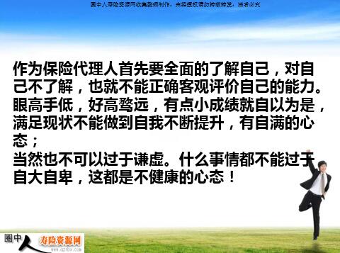 保险营销员应有的心态 在保险营销中,大多数保险代理人可能首要想到的是如何提高销售技巧,似乎这是提高销售和体现自我的最大途径,其实不然,在销售中,你的心态,很大程度上决定着你是否营销成功。 作为营销一员,我们应有的心态? 对待工作的心态 对待自己的心态 对待挫折的心态 对待客户的心态 对待公司、对待产品的心态 对待工作时的心态 首先我们要把保险营销当作一项事业来经营。有些人是在求职无门的情况下,无可奈何经别人介绍或是朋友拉着的情况下才不得不去做保险营销,从心态上就没有把心态摆正,抱着无所谓的态度,所以在内心上就已经否定了保险代理人的工作。 21世纪最具高薪职业当中,销售人才稳居第一位,保险代理人也正是销售的一种。这几年保险业保持快速发展,推动力在哪里? 在这个高尚、有朝气、有意义的行业里,不正是代理人的辛勤劳动,客户才可以熟悉保险,满足他们需求,让他们在生活中有了保险的保障。 对待自己的心态 作为保险代理人首先要全面的了解自己,对自己不了解,也就不能正确客观评价自己的能力。眼高手低,好高骛远,有点小成绩就自以为是,满足现状不能做到自我不断提升,有自满的心态; 当然也不可以过于谦虚。什么事情都不能过于自大自卑,这都是不健康的心态! 理想的心态是结合自己的实际,不脱离周围的环境,有切实可行的目标和计划,对待计划出现的偏差要及时发现和修正,通过目标来激励自己,实施中根据所缺,来针对性的学习,在学习中实践进步,熟悉保险专业知识,相信自己是有能力的人,会让客户信赖的,也会有出色的时候。 对待挫折的心态 做销售的哪有不碰到挫折的,关键是碰到挫折时的态度。“愈挫愈勇,屡败屡战”肯定是一个优秀保险代理人心理素质的代名词。这就需要我们去正确认识剖析挫折和失败的原因,需要百折不挠的勇气。代理人总会在展业中遇到挫折,每个人都会这样那样的浮躁,有了浮躁没了耐心,也就失去以后成功的准备,就不会发现自己某些方面的不足,也许再坚持一下就会好些,失败和成功总是对半开的,原因很简单: 成功比失败多咬牙坚持了一下!所以要坦然面对挫折,把挫折看作是成长和成熟的标志,有了这些标志,就说明已经在成功道路上了。 对待客户的心态 保险代理人的客户从广义上说:在生活中需要帮助的人都是我们的客户。随着近几年保险业的快速发展,保险意识已经深入人心。我们只需要去认真对待每一个客户,尊重他们,关心他们,和每一个客户做朋友。给客户以“可靠的关怀”和“贴心的帮助”,这才是面对客户时正确的心态。因为你怀有这颗心,才可以“想人所想,及人所及”。