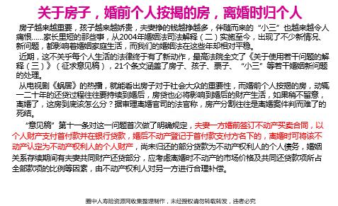 最高人民法院近期发布《婚姻法》司法解释(三),共19条,已于8月13日正式实施,重点对结婚登记瑕疵的救济手段,亲子关系诉讼拒绝亲子鉴定后果,父母为子女结婚购买不动产的认定,离婚案件中一方婚前贷款买房的处理等问题做出明确规定。 关于房子,婚前个人按揭的房,离婚时归个人 房子越来越重要,孩子越来越娇贵,夫妻挣的钱越挣越多,伴随而来的“小三”也越来越令人痛恨……家长里短的那些事,从2004年婚姻法司法解释(二)实施至今,出现了不少新情况、新问题,都影响着婚姻家庭生活,而我们的婚姻法在这些年却相对平稳。 近期,这不关乎每个人生活的法律终于有了新动作,最高法院全文了《关于使用若干问题的解释(三)》(征求意见稿),21个条文涵盖了房子、孩子、票子、“小三”等若干婚姻新问题的处理。 从电视剧《蜗居》的热播,就能看出房子对于社会大众的重要性,而婚前个人按揭的房,动辄一二十年的还贷过程往往要持续到婚后,房贷也必将影响到婚后的财产生活,如果稍不留意,离婚了,这房到底该怎么分?据审理离婚官司的法官称,房产分割往往是离婚案件判而难了的死结。 “意见稿”第十一条对这一问题首次做了明确规定,夫妻一方婚前签订不动产买卖合同,以个人财产支付首付款并在银行贷款,婚后不动产登记于首付款支付方名下的,离婚时可将该不动产认定为不动产权利人的个人财产,尚未归还的部分贷款为不动产权利人的个人债务,婚姻关系存续期间有夫妻共同财产还贷部分,应考虑离婚时不动产的市场价格及共同还贷款项所占全部款项的比例等因素,由不动产权利人对另一方进行合理补偿。 给儿子买的房,儿媳没有份 房子一直都被不少老百姓视为结婚的物质保障,“有了房才有结婚的可能。”不过,目前年轻人的收入和房价不成正比,而做父母的往往会帮着子女买房子。问题就来了,给儿子买的房,儿媳有份没? 从目前流行的财产赠与公证就能看出大家的诸多疑惑。 “意见稿”第八条对此做了规定,婚后由一方父母出资购买的不动产,产权登记在出资人子女名下的,可视为对自己子女一方的赠与,应认定该不动产为夫妻一方的个人财产。 丈夫送老婆房子未过户前可反悔 关于房产的交易无所不在。 “意见稿”考虑到了夫妻间赠与房产的行为。第七条规定,婚前或婚姻关系存续期间,双方约定将一方所有的房产赠与另一方,一方在赠与房产的权利转移之前撤销赠与,另一方请求判令继续履行的,人民法院不予支持,但已经办理公证的除外。 就是说,丈夫送给老婆的房,就算给了承诺,未过户前也是可以反悔的,只要这个赠与没有经过公证。 专家看新婚姻法解释 马亿南——新婚姻法使女性将婚姻视为保险的希望破灭 赵格羽——新《婚姻法》前,女人,梦该醒了 如果地球不再转动,我是否还可以遇上你 如果太阳不再发光,我是否还可以看着你 如果生命不复存在,我是否还可以爱恋你 只要我还可以触你的手 我就要把你拥抱,将“我爱你” 尽情倾诉…… 我们期待…… 如果一定要用一个比喻来形容婚姻,我觉得婚姻就是一场双人舞。两人携手步入舞池,在同一首乐曲中起舞。舞蹈是否优美得两个人都要跳的好看,需要彼此协调和努力。否则,一味的责怪对方,只会造成曲未终而人先散……”