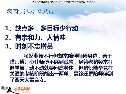 唐僧的成功之处 他姓陈,名袆,乳名江流,18岁入司,苦心钻研基本法,业务知识在公司里首屈一指。但他喜欢一个人做业务,不喜欢带徒弟。李世民当公司总经理时,交给他一个任务,叫他到西天职场去取经,学习别人的先进管理经验,并答应给他一定的奖励。他答应了!但是,当时交通工具缺乏,经济落后,为此,他踏上了艰苦的取经之路! 1、生来不安分 2、能力、技巧一流 3、善于利用关系转介绍 4、能扫清障碍 5、情绪易波动 唐僧的增员动作至关重要,没有孙悟空,唐僧团队断然无法取得真经。 业务高手-孙悟空 1、缺点多,多目标少行动 2、有亲和力、人情味 3、时刻不忘增员 虽然业绩不行但却常陪伴师傅身边,善于哄师傅开心让师傅不感到孤独,尽管老猪经常打退堂鼓,动不动就要回高老庄,但猪悟能毕竟在关键的考核阶段能出一两单,最终还是陪师傅到了西天大雷音寺。 氛围制造者-猪八戒 1、勤勤恳恳 2、任劳任怨 3、维持、考核不愁 沙僧是整个团队的忠实战友,他是团队的目标的坚定执行者。一个健康的,有战斗力的团队就缺少不了像沙和尚这样的优秀组员。(简单,听话,照做) 模范标兵-沙和尚 1、团队的中心灵魂人物 2、信念坚定,百折不回 3、目标远大,不懈追求 4、心太软、有时不辩是非 没有唐僧,就没有取经的团队!(增员) 没有唐僧的坚持,就没有取经的成功!(根本) 主管(核心)-唐僧 唐僧的成功之处 -不仅仅是团队 1.营销高手(非浑然天成) 2.玄奘精神(乃内在潜质) 不至天竺,终不东归一步 玄奘精神已经成为整个中华名族的精神财富,而我们缺少的就是法师这种不畏艰辛,为法忘躯的精神! 我又要做业务 我又要去增员 我怎么这么苦 增员纠结 1.说了不来 2.来了不考 3.考了不过 4.过了不做 业务纠结 1.说了不听 2.听了不签 3.签了不给 4.给了又退 两界山头第八难--拥有高手(难管) 陡涧换马第九难--骑上宝马(工具) 收降八戒十二难--改善氛围(混子) 收得沙僧十六难--获得标杆(好人) 万民供养 享受津贴 来年大主管 为什么我能做到业务 我却很难去有效增员 扪心自问:我一个月增员访有10次吗?