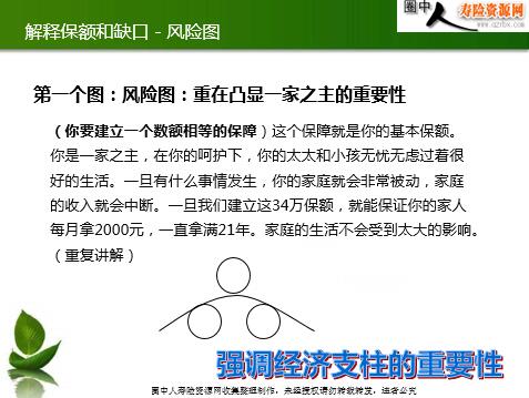 解释保额和缺口-风险图 第一个图:风险图:重在凸显一家之主的重要性 (你要建立一个数额相等的保障)这个保障就是你的基本保额。你是一家之主,在你的呵护下,你的太太和小孩无忧无虑过着很好的生活。一旦有什么事情发生,你的家庭就会非常被动,家庭的收入就会中断。一旦我们建立这34万保额,就能保证你的家人每月拿2000元,一直拿满21年。家庭的生活不会受到太大的影响。(重复讲解) 解释保额和缺口-资产图 第二个图:资产图——重在强调受益人 不过你放心,根据我们公司的调查,99%的客户都是平平安安的。这样最终你会建立一笔34万的资产。这笔钱是你的个人财产。(重复)你是一家之主,为家庭做的贡献最大,将来到老的时候为自己建立一笔资产也是应该的。 请问受益人写你的父母和爱人行吗? 现在的女性比男性的平均寿命长3-5岁,一般来讲这笔钱你太太可以拿到,而且到那个时候,这笔钱对她来说是最重要的。 34万资产 解释保额和缺口-压力图 第三个图:压力图——重在强调现在就要解决 我们再来看看我们的家庭状况,这是我们,上有老下有小,压力非常大。这是西方国家的家庭结构,因为老人在年轻时已经解决了自己老年的问题,所以年老时不会给孩子造成压力,甚至还会给孩子留下一笔财产。 你现在还年轻,还有时间,我想现在把年老时的问题解决掉,这对孩子的将来,是最大的幸福。你说我讲得有没有道理?
