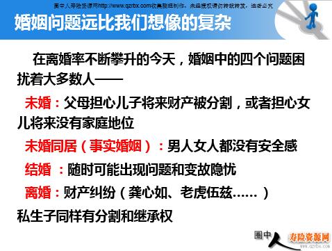 源自于思考—— 常说“保险可以拿走客户的担忧”,那么—— 客户真正担忧的是什么? 保险的功用又是什么? 源自于思考—— 保险稳定的是家庭! 维系家庭的是什么? ——婚姻! 为什么说“保险是社会的稳定器”?保险稳定了什么? 在离婚率不断攀升的今天,婚姻中的四个问题困扰着大多数人—— 未婚:父母担心儿子将来财产被分割,或者担心女儿将来没有家庭地位 未婚同居(事实婚姻):男人女人都没有安全感 结婚 :随时可能出现问题和变故隐忧 离婚:财产纠纷(龚心如、老虎伍兹…… ) 私生子同样有分割和继承权 婚姻问题远比我们想像的复杂 《婚姻法》规避婚姻风险的作用 提供区分婚前个人财产与婚后共同财产的法律保障 《婚姻法》常用条例 P4第十七条:夫妻共有财产 P5第十八条:属于夫妻一方的财产 P10第三十九条:夫妻共同财产的离婚处理 P15:事实婚姻 P24:投资性财产的分割 P25:有限责任公司出资额的分割 P25:涉及合伙企业中夫妻共同财产份额的分割 P26: 独资企业财产分割 P26:夫妻共同财产中的房屋价值及归属 ——在中国传统、陈旧的观念中有个特点,容易把女性摆在没有地位的一个认识中,自古就如此,现在虽然好一些了,但未来结婚以后,她的经济地位仍然会决定她的家庭地位。您认同吗? 1.经济地位决定家庭地位 女孩的需求现状(1/3) 2.孩子在家庭有地位的体现形式 ——如果您女儿每年至少有30万的固定收入,还能不用担心工作,持续不断地领一辈子,那娶了您的女儿就等于娶了个银行,因为那每年领取的一大笔钱,她在家庭中就会受到尊重与爱护,难道这不是您所希望的吗? 女孩的需求现状(2/3) 3.《婚姻法》中的个人财产定义 ——最关键的是:这笔钱是受法律保护不被分割的!《婚姻法》P4-5第十七和十八条对夫妻共有财产和个人财产做了明确的划分,这张保单将是您女儿的婚前财产,任何情况下不会被分割! 女孩的需求现状(3/3) 男孩的需求现状(1/3)