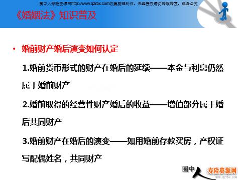 婚姻法新解与保险 一个笑话 一个富翁要给太太买生日礼物,问:“你是想要一条船呢还是想要一架直升飞机呢?” 太太想了想,“我什么都不要,我想离婚。” 富翁愣了一下,说:“对不起,我还不打算送这么贵重的礼物。” “除了死亡,还有什么比离婚更痛苦?” ——英国女作家 佛吉尼亚·艾恩赛德 “比离婚更痛苦的是,婚离了,房子也没了。” ——中国网友 了解《婚姻法》 1950年5月1日公布施行的《中华人民共和国婚姻法》是新中国颁布的第一部法律。 1980年9月10日,第五届全国人民代表大会第三次会议通过了新的《婚姻法》;自1981年1月1日起施行。 第一次解释 —— 2001年12月24日通过 第二次解释 —— 2004年4月1日起施行 第三次解释 —— 2011年8月13日起施行 热议焦点 首次明确夫妻一方个人财产婚后产生的孳息和自然增值不是共同财产。-第五条 明确婚后一方父母出资为子女购买不动产且产权登记在自己子女名下的应认定为夫妻一方的个人财产。-第七条 首次明确离婚案件中一方婚前贷款购买的不动产应归产权登记方所有。-第十条 最高法院的声音 近五年来,我国离婚率逐年上升,2010年,全国有267.8万男女依法办理了离婚手续,今年一季度,46.5万对夫妻向法院提出离婚,同期增加17%。 婚姻家庭纠纷案件逐年上升,案件集中反映出婚前贷款买房,夫妻间赠与房产等问题 父母出资为子女购房往往倾注了全部积蓄,离婚时一概将房屋认定为夫妻共同财产,势必违背了父母为子女买房的初衷,侵害了出资购房父母的利益。 “保险”才是真保险! —— 婚姻不保险 —— 房产不保险 —— 养老金不保险 力挺派 改变适婚男女的择偶观,使得年轻人不再为“房子而结婚” -彻底AA制,想嫁富二代,傻了吧;潜力股好过有房男 理智结婚,利于对社会稳定 -失去诚意的结合,任何婚姻也走不远 不再让“丈母娘推高房价”成为中国特色 -乐了地产商,愁了丈母娘 打击骗婚,鼓励独立 -养儿不亏了,不用防儿媳 离婚,好聚好散将增多 -律师轻松了 拍砖派 父母给儿子买房,儿媳没份 一辈子操劳,耗尽了青春,徒留伤悲 偏向男士,保护强者 -出轨成本降低,离婚已无后顾之忧 女性没有安全感,爱情也丧失浪漫感 -爱情和婚姻不是一回事了 不要埋怨: 婚姻法不负责挽救你的婚姻和财产 《婚姻法》知识普及 哪些财产属于婚前财产 夫妻一方所有的财产,不因婚姻关系的延续而转化为夫妻共同财产: 1.婚前个人所有的财产,如工资、奖金,生产经营所得,继承或赠与所得; 2.一方婚前已经取得的财产权利; 3.婚前财产的孳息,包括个人财产婚前孳息和婚前个人财产婚后孳息; 4.一方婚前以货币、股权等形式存在,而婚后表现为另一形态财产。 《婚姻法》知识普及 婚前财产婚后演变如何认定 1.婚前货币形式的财产在婚后的延续——本金与利息仍然属于婚前财产 2.婚前取得的经营性财产婚后的收益——增值部分属于婚后共同财产 3.婚前财产在婚后的演变——如用婚前存款买房,产权证写配偶姓名,共同财产 《婚姻法》知识普及 何为夫妻共同财产 夫妻在婚姻关系存续期间所得的下列财产归夫妻共同所有: 1.一方或双方的工资、奖金收入及各种福利性政策性收入、补贴; 2.一方或双方从事生产、经营的收益; 3.一方或双方拥有的知识产权的收益; 4.一方或双方因继承遗产和接受赠与所得的财产; 5.其他应当归共同所有的财产: (1)包括一方以个人财产投资取得的收益; (2)男女双方实际取得或者应当取得的住房补贴、住房公积金; (3)男女双方实际取得或者应当取得的养老保险金、破产安置补偿费; 《婚姻法》知识普及 如何约定夫妻共同财产 1.夫妻可以约定婚姻关系存续期间所得的财产以及婚前财产归各自所 有、共同所有或部分各自所有、部分共同所有。 2.夫妻财产公证主要分为婚前财产公证和婚后财产公证。 3.应当采用书面形式。
