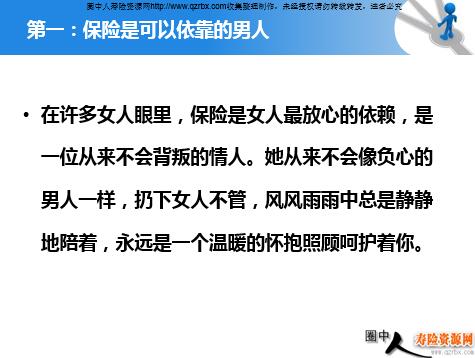 第一:保险是可以依靠的男人 在许多女人眼里,保险是女人最放心的依赖,是一位从来不会背叛的情人。她从来不会像负心的男人一样,扔下女人不管,风风雨雨中总是静静地陪着,永远是一个温暖的怀抱照顾呵护着你。 第二:保险是陪伴你终生的朋友 寿命对于每个人来说都是公平的,女人最大的幸福是长寿,任何一个女人都比男人多活8至10年的概率。女人最大的不幸也是长寿,任何一个女人都要有当10至8年寡妇的准备。当男人自然离开你的时候,只有保险将成为男人的缩影和最好的朋友,而且一直陪伴你到终生。 第三:保险提高身份的资本 有了保险的女人总比没有保险的女人贵重,在平时拥有保险的女人在与老公生活在一起时,好象总有另一个情人陪着;一旦因意外需要改变生活的时候,保险给你带来的是身价和尊严,给你带来的是更多的选择和主动,拥有保险的女人更是女性能力和地位提升的体现。 第四:保险好比结婚的合同 女人与男人结婚是两个活生生的主体,虽然有了一本结婚证明作保证,但这份保证是不牢固的,会因一方的违约而终止合同,而保险与女人的结合完全不同,保险自始自终是忠诚的,永远聆听女主人的使唤,是一个永远不会违约的男人。 第五:保险是女性保持青春的礼品