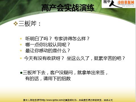 老王如何谈保险 高产会特别奉献 高产会四原则 高产会实战演练 三板斧: 听明白了吗? 专家讲得怎么样? 哪一点你比较认同呢? 最让你感动的是什么? 今天有没有收获呀? 坐这么久了,挺累辛苦的吧? ●三板斧下去,客户没疑问,就拿单出来签, 有的话,请用下的招数 评金樽 ■你看那些金樽金光闪闪,代表着福气和运气,来, 我们也去沾沾福气!(注意边说边做。要热情!) ■哇,你看有那么多人都想去看金樽,沾沾福气, 我们也去看看吧(要用你的热情带动客户的热情) ● 永远记住:销售是信心的传递,情绪的转移 沟 通 观 念 王小姐,我能不能告诉我保险到底有什么用? 保险其实很简单,就是解决自己无法承受的风险。保险是解决风除的!既然来了,我们就一起来来分析一下,人生到底会有哪些风险,好吗? 人身风险 意外 门诊 疾病 住院 大病 残疾 身故 ●如何应对健康风险?我们惟一的能做的就是转移风险,把风险转移给保险公司,但我们也明白保险公司不是慈善机构,所以,我们可能要付出一点点代价:也就是说2。2元/天,就有了48万的保障,30元/天就有了30万的健康保障 我知道这些你能完全应付得了,坦白地说,你可能有很多的资产但没有足够的现金,但生老病死谁也不知道它什么时候发生,很显然,在财务里做大量的现金安排是不现实的。所以说,保险就是以小博大的急用的现金,可以帮你解决突如其来的人生尊严问题。无论你是什么人,你都值得拥有! 华人首富李嘉诚说过:别人都说我很富有,拥有很多财富,其实真正属于我个人的财富,是给自己和家人买了充足的人寿保险, 沟 通 观 念 我们为什么需要保险?保险到底有什么用? 人身风险 财务风险 意外 门诊 教育 疾病 住院 养老 大病 增值 残疾 避税 身故 抵涨 ●子女教育,个人养老,资产增值,做帐避税,抵制澎涨等问题 我们都希望我们的子女能够接受良好的教育,希望我们自己有一个安祥,舒适的晚年,希望我们的生活过得有尊严 ● 那么有什么渠道可以达到这个目的呢? 1)银行:你可能不会!利息永远跑不过CPI 2)股票,基金,要玩,但要适可而止 3)物业,房子要有,房子的泡沫很大,房子是用来住的,不是用来炒的, 房子和档口的变现能力很差,很容易被拍卖 4)生意:看看犹太人是怎么做生意的。每赚一笔钱,1/3(消费,保存,投资)