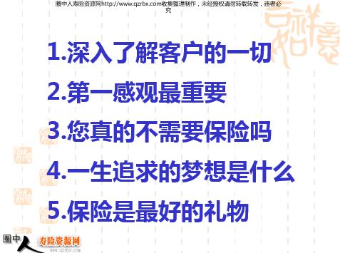 一、不走寻常路 1.保险是什么? 我们是帮助客户制造问题? 我们还是帮助客户解决问题? —— 帮助 2.销售是什么? —— 接受 二、态度比观念更重要 1.积极是成功的良方 2.乐观是人生的命脉 保险的特质是什么? 经得住诱惑 耐得住寂寞 三、礼物拿在手,保险好开口 1、行为决定你的收入 2、靠嘴、靠腿、靠脑子 四、培养自己乐观的人生观 1.具有推销自己思想和产品 的能力 2.书,是最好的老师 五、不断的联系客户 1.其实许多大门都为想成功的人敞开着 2.事业是最好的开门钥匙 六、接触高端客户的技巧 1.深入了解客户的一切 2.第一感观最重要 3.您真的不需要保险吗 4.一生追求的梦想是什么 5.保险是最好的礼物 6.保险是自己最好的朋友 7.长期长远投资的必要性 8.理财能让我们更幸福 9.把保单做大交费更短 10.资产配置的理由 七、帮助客户选择产品 1.最好只卖一种产品 2.找出家庭的重点 八、险种介绍有妙招 1.给客户下决心 2.一张保单一生为友 业务员卖 产品 业务员卖 缘故 业务员卖 服务 三流 二流 一流 销售高手业务员卖 超级高手业务员卖 观念 帮助客户如何去买? 财富管理和资产的配置 九、慈善家就是保单王 1.送保单有学问 2.向高峰挑战自己 十、向目标出发,用结果说话 1.在梦想中成长 2.MDRT向每一个人招手 再烦,也别忘微笑; 再急,也要注意语气; 再苦,也别忘坚持; 再累,也要爱自己。
