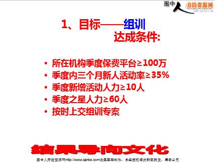 1、目标——组训 达成条件: 所在机构季度保费平台≥100万 季度内三个月新人活动率≥35% 季度新增活动人力≥10人 季度之星人力≥60人 按时上交组训专案 2、信念——结果导向文化 分以下几种结果: (1)如期保质保量达成 (2)提前或超额达成 没有第三种结果 3、方法——开会,培训,沟通 (1)开好几个会 (2)搞好几个培训 (3)沟通几个人 3-1 开会 (1)通过早会、二次早会、主管会等等来统一所有伙伴的思想和目标,拧成一股绳,劲往一处使 (2)各种形式的产说会 通过大型酒会 下乡酒会 客场、简说会 职场产品说明会等 拉升业务团队的活动率 以及针对新人和XX星人员的专场说明会 (2)各种形式的产说会 3-2 培训 (1)充分利用公司培训“3+2”项目 (2)分公司每月一次的“TOP12000”拉升新人活动率和XX星人力 (3)分公司的“TOP2000”和“TOP300”增加主管的增员意愿 (4)中支每月一次的准主任培训以及新晋升主管的培训 (5)四级机构每月两次的新人培训和每周两次的衔接训练 3-3 沟通 坚持每天和三个以上的人沟通,制定短期目标解决展业过程中的个别问题 和领导沟通达成一致 总结: 创造奇迹 奇迹诞生的途径 1968年的春天,罗伯·舒乐博士立志在加州用玻璃建造一座水晶大教堂。他向著名的设计师菲力普·强生表达了自己的构想:“我要 的不是一座普通的教堂,我要在人间建造一座伊甸园。” 强生问他预算,舒乐博士坚定而明快地说:“我现在一分钱也没有,所以一百万美元与四十万美元的预算对我来说没有区别, 重要的是,这座教堂本身要具有足够的魅力来吸引捐款。” 教堂最终的预算为七百万美元。七百万美元对当时的舒乐博士来说是一个不仅超出了能力范围,甚至超出了理解范围的数字。 5、寻找70笔10万美元的捐款; 6、寻找100笔7万美元的捐款; 7、寻找140笔5万美元的捐款; 8、寻找280笔25000美元的捐款; 9、寻找700笔1万美元的捐款; 10、卖掉10000扇窗,每扇700美元。 60天后,舒乐博士用水晶大教堂奇特而美妙的模型打动富商约翰.可林,他捐出了第一笔100万美元。 第65天,一位倾听了舒乐博士演讲的农民夫妇,捐出了第一笔1000美元。 90天时,一位被舒乐孜孜以求的精神所感动的陌生人,在生日的当天寄给舒乐博士一张100万元的银行本票。 8个月后,一名捐款者对舒乐博士说:“如果你的诚意与努力能筹到600万元,剩下的100万元由我来支付。” 第二年,舒乐博士以每扇500美元的价格请求美国人认购水晶大教堂的窗户,付款的办法为每月50美元,10个月分期付清。6个 月内,一万多扇窗全部售出。 …… 1980年9月,历时12年,可容纳一万多人的水晶大教堂竣工,成为世界建筑史上的奇迹与经典,也成为世界各地前往加州的人必去瞻 仰的胜景。 水晶大教堂最终的造价为2000万美元,全部是舒乐博士一点一滴筹集而来。 在生活中有多少事情都是我们认为是不可能实现的?有多少事情是因此而搁浅的?舒乐博士的成功在于敢想而且肯为之付出努 力。 结论—— 其实工作很简单 ──不断地制定目标, 不断地实现目标。