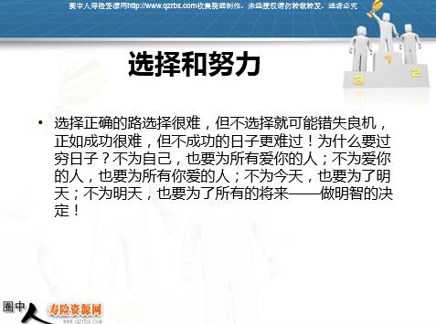 一天,动物园的管理人员发现袋鼠跑出了笼子,大为紧张,于是就将笼子的高度从10米加到了20米。到了第二天,管理人员发现袋鼠又跑了出来,于是就将笼子从20米加高到了30米。可是到了第三天,袋鼠还是跑了出来,管理人员只好将笼子加高到了40米…… 就这样,终于笼子被加高到了100米。 如何的选择 这天,袋鼠的邻居长颈鹿问到:袋鼠老弟,你说,明天,那些人们会不会又加高笼子啊? 只见袋鼠满不在乎的说:如果他们走的时候还是忘了将门锁上的话,我倒不介意每天都能出去溜溜! 选择和努力 选择是方向,努力是方法,方向错,一错百错。方向对,一对百对。努力没有对与错,努力只有勤与懒。方向错误,一生不努力,废一生,要成功在于选择! 命是天注定的,而运却时刻把握在自己的手中。尽管如此,为什么还有这么多碌碌一生,无所作为的人呢?而对于此,我们是否有考虑呢? 选择和努力 人的一生会面临许多机会,当机会来临的时候,您是否清楚自己下一步要迈向哪里吗?您众多的机会之中您选择的机会是否正确呢?所以,对于我们每个人来说,学会选择是人生中最重要的一课。 选择和努力 选择正确的路选择很难,但不选择就可能错失良机,正如成功很难,但不成功的日子更难过!为什么要过穷日子?不为自己,也要为所有爱你的人;不为爱你的人,也要为所有你爱的人;不为今天,也要为了明天;不为明天,也要为了所有的将来——做明智的决定! 穷人之所以穷,很多时候不是因为没有梦想,而是没有去把梦想变成现实。法国有位贫穷的年轻人,经过十年的艰苦奋斗,终于成为媒体大亨,跻身于法国50名大富翁之列。1998年他去世,将自己的遗嘱刊登在当地报纸上,说:我也曾是穷人,知道“穷人最缺少的是什么”的人,将得到100万法郎的奖赏。几乎有两万人争先恐后地寄来了自己的答案。答案五花八门。大部分的人认为,穷人最缺少的是金钱。另一部分人认为,穷人最缺少的是机会、技能……但没有人答对。一年后,他的律师公开了答案: 或许现在的你,没有一个很高超的技能,也没有很多的资本,但请记住,您一定要有野心!成为成功者的野心! 昨天是一张早己废弃的支票 明天是一笔不可提前支取的存款 只有今天才是摆在你面前的可以使用的现金。 把握今天、把握现在! 只有把握好今天、把握好现在, 才能把握好命运!把握好人生! 保险行业有句话叫做只有动才能活。特别对保险业务员来说,没有行动一定都为零。行动的过程中也要掌握方法,有大部分的伙伴在早会上听完专题之后非常心动,早会后一路上也会冲动,一旦回到家就一切不动。行动不是冲动,有效的行动才是真正的行动。 行动是唯一的良方 ...........