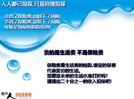 人人都已投保,只是向谁投保 支出了保险费,也卸下了风险; 节省了保险费,却留下了风险; 保险是您最明智的投资! 贵的是生活费 不是保险费 保险费是生活费的缩影,便宜的保费代表贫穷的生活。 您愿意未来的生活水准打折吗? 请提出二十分之一的收入投保吧! 你与佛祖签约了嗎? 没有人能与佛祖签约,幸好您可以与保险公司签约; 在虔诚的祈祷之后请立即实际的行动 与保险公司签约! 久病无孝子? 这是一個实际的问题,幸好人寿保险能帮助我們 虽然卧病在床仍能抓住子女的心! 完整的移转财产 巨额的赠与稅或遗产稅,常使财产严重的打折扣; 巧妙的运用保险,可以保全您财产的完整! 不能查封的财产 生意往来难免有借有贷,汽车,.房屋.机器…..等财产,都会因债务被查封拍卖; 只有人寿保险的保单,永远不必担心被查封! 聪明与幸运 相同遭遇,不同结果 只因当初正确地选择 保险使您聪明地享受人生 而不需要依赖幸运 谁想得到? 想自杀的人没事 正好经过的人被压死了 还是买个保险来免除后顾之忧 快乐出门,平安回家 原来这不是理所当然的事…… 原来人是那么的脆弱…… 原来到时候就来不及了…… 原来现在投保…… 才能免于意外事故的二次伤害 等!等!等! 寿险营销员当然可以等, 但我们可以叫疾病、意外灾害、 残废、死亡等以后再来吗? 对不起,我失败了! 别让您的子女 和关心他们未来生活的朋友 失败而归 保险使您成为永不失败的父母 您能陪他长大吗? 虽然不一定能陪着子女长大 但爱心却一定可以与他相伴 ----只要拥有一份适当的保险 大学毕业前父亲不幸身故所占比例 预备胎 您的车子有预备胎 您的家庭经济可有预备胎? 保险就是最佳的经济预备胎 刹车 汽车上坡最怕出状况 刹车可保安全不致下滑 保险正如家庭经济的刹车 可永保目前的生活水平 税务局的礼物 抱怨税赋太重, 不如思考节税之道, 买保险不只有保障还可以节税。 免税的乐园 人人都说国家万万税 可是不知道有个免税的乐园 保险可以使虎视眈眈的税务员 ...........