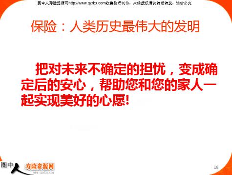 胡适博士 胡适说:“保险的意义只是今天做明天的准备,生时作死时的准备,父母作儿女的准备,儿女幼时作儿女长大的准备,如此而已。今天预备明天,这是真稳健,生时预备死时,这是真豁达,父母预备儿女,这是真慈爱。能做到这三步的人,才能算作是现代人。 (一)家庭保障 (二)医疗保障 (三)意外保障 (四)子女保障 (五)养老保障 人寿保险的五大保障 我们每天辛劳的工作最重要的目标是——赚钱 为至爱的家人提供最好的一切! 当收入突然中断时, 将会发生什么困境呢? 如果购买医疗保险, 当医院向我们拿钱的时候, 3元钱里面,保险公司支付2元,我们只需支付1元! 这难道不是一个明智的选择吗? 不幸事件的发生往往始料不及…… 花无百日红 人无千日好 反映您的生命价值 人寿保险… 保险体现你的生命价值 让我们来算一算: X = 常年 平均收入 工作年份 您的 生命价值 5万 20年 100万 12