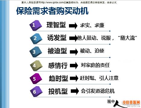 关于保险的消费者行为 目 录 保险需求 保险需求的特征 影响保险需求的因素 保险需求者购买动机 影响保险需求的因素 保险需求 保险需求是人们在一定时期内通过保险 市场交换来转移风险而产生的要求与欲望, 是促成投保行为的内在动力。它是保险市场 存在的必要前提。 保险需求 马斯洛需求层次 自我实现 尊重需要 社会需要 安全需要 生理需要 自我实现 尊重需要 社会需要 自我实现 尊重需要 心里安全保险需求 经济安全保险需求 职业安全保险需求 劳动安全保险需要 生理安全保险需要 人身保险需求层次 自我实现 尊重需要 社会需要 自我实现 尊重需要 安全需要 社会需要 自我实现 尊重需要 生理需要 安全需要 社会需要 自我实现 尊重需要 经济安全保险需求 心里安全保险需求 经济安全保险需求 职业安全保险需求 心里安全保险需求 经济安全保险需求 劳动安全保险需要 职业安全保险需求 心里安全保险需求 经济安全保险需求 生理安全保险需要 劳动安全保险需要 职业安全保险需求 心里安全保险需求 经济安全保险需求 渐进性 保险需求的特征