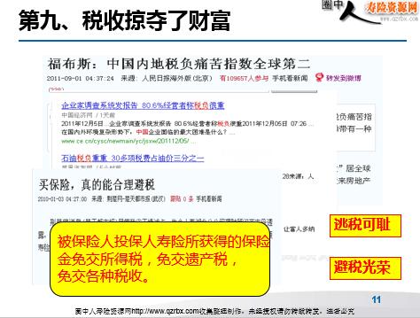 目 录 1、 C P I绑架了财富 2、 疾病中止了财富 3、 意外中断了财富 4、 浪费透支了财富 5、 情面流失了财富 6、 离婚分割了财富 7、 贪婪吞噬了财富 8、 子女挥霍了财富 9、 税收掠夺了财富 10、债务毁灭了财富 第一、CPI绑架了财富。 CPI超过3%是通货膨胀,超过5%是严重通货膨胀,2011年10月CPI高达5.5%,这已经是是严重的通货膨胀了。 第二、疾病终止了财富。 第三、意外中断了财富 保险最大的好处就是不仅让我们现在有钱赚,及时发生预料之外的事故也让我们拥有一定的价值! 2008年国家交通部统计,车祸每天就有301人死亡,民政部披露2010年全国各类自然灾害共造成4.8亿人次死亡。 第四、浪费透支了财富 有钱的时候就喜欢挥霍,其实超额的消费就是浪费! 比如:孩子的玩具用完了就成了废品 女人的服饰经常买回来就被打入“冷宫” 阔气的煤老板拥有200万以上的车子将近30部 第五、情面流失了财富 所以我们要有原则的谈面子,讲情面不能放弃原则,强调面子要顾及后果。 第六、离婚分割了财富 第七、贪婪吞噬了财富 第八、子女挥霍了财富 亿万财富可以挥霍一空,因为子女们没有驾驭亿万财富的能力! 第九、税收掠夺了财富 第十、债务毁灭了财富 合理的财富规划和资产配置,对于中产阶级,叫做优选理财产品。现有的资金不可能既做房产,又搞黄金、股票、期货和买保险,所以只能优选,人寿保险相对较好,如果你是很富有的人,就必须要做好资产配置,因为人生保险是平衡投资,虽然不是最赚钱的投资。只有这样财富才可以延续,真正做到“富可以三代”。
