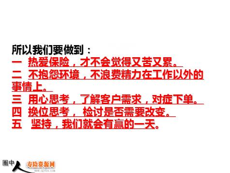 麻 将 麻将VS保险 第一,从时间上看 第二,从环境上看 第三,从技能上看 第四,从心态上看 第五,从精神层面看 第一:从时间上看 早到早开工主动加班加点 为什么麻将能做到呢?因为大家都喜爱这个娱乐活动。因此做好保险的前提是要热爱这项事业。 如果热爱就不会觉得又苦又累。 第二:从环境上看 艰苦朴素因地制宜废寝忘食 职场差?奖励少?竞争激烈? 整天把精力放到了对工作本身的苛刻要求上,无法排除外界条件对事业的干扰。 第三:从技能上看 高手不用看,手一摸就知道是什么牌 心有多大,你的牌就有多大,心有多大保单就有多大! 第四:从心态上看 换位思考 当我们总没有业务的时候,就应该换位思考一下检讨自己是否有做错的地方,或者是需要改变下策略。 第五:从精神上看 永不服输永不言弃 很多业务员因为营销难度大纷纷转行,可是谁又知道,遇到困难就放弃那他等于放弃了赢的权利。 在保险这个行业,只要我们在坚持,我们就会有赢的一天。 所以我们要做到: 一 热爱保险,才不会觉得又苦又累。 二 不抱怨环境,不浪费精力在工作以外的事情上。 三 用心思考,了解客户需求,对症下单。 四 换位思考, 检讨是否需要改变。 五 坚持,我们就会有赢的一天。 客 户 保 费 险 种 业务员