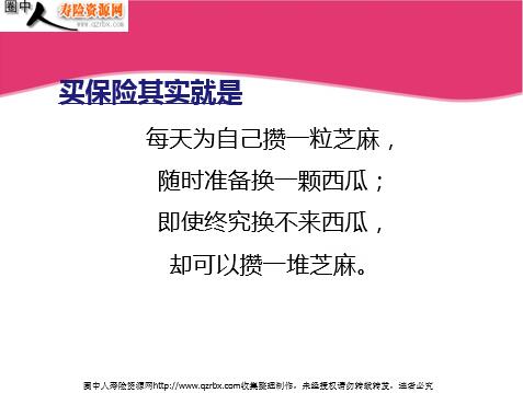 保险的根本意义 我为人人,人人为我集万家之财,济一家之灾 人有一天会不会老?老的结果是什么?死之前一般会不会病?病了一般要不要看医生?看医生要不要花钱?花自己的血汗钱会不会心痛?找个地方报销90%怎么样?预先办个医疗卡可以吧? 30秒卖出保险 让我们认清两个事实 1.在物质世界里,我们一定会遭受变故,也 就是说我们一出生就面临着变故。 我们一定会老,我们一定会有一天离开,我们也许会有疾病,我们也许会有意外。 2.当变故发生的时候,我们最需要的是什么?。 ----钱。为自己,为家人,为孩子!! 买保险其实就是 每天为自己攒一粒芝麻,随时准备换一颗西瓜;即使终究换不来西瓜,却可以攒一堆芝麻。