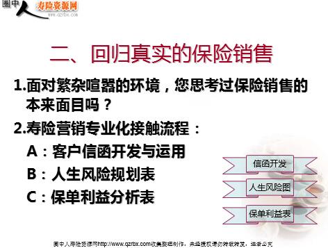自在人生~精彩极致的保险生涯 一: 风云际会中洞悉生涯规划 1. 塑造经营事业的理念 2. 培植自我的核心竞争力 3. 如何做好寿险事业的永续经营 1. 塑造经营事业的理念 工作~一份收入—为了生活职业~有兴趣的能持久干下去的工作事业~成就一生的生涯规划寿险从业人员要想成就一番事业的第一思考题: 如何塑造自己成为客户心目中不容被取代的地位 Q:工作. 职业. 事业有何不同? 2. 培植自我的核心竞争力 积累~客户、能力、经验积累的效应~相乘或相加积累最大的忌讳~中断 寿险从业人员的核心竞争力是什么? 3. 如何做好寿险事业的永续经营 二、回归真实的保险销售 1.面对繁杂喧嚣的环境,您思考过保险销售的本来面目吗? 2.寿险营销专业化接触流程: A:客户信函开发与运用 B:人生风险规划表 C:保单利益分析表 信函开发 人生风险图 保单利益表 三、人生财务规划VS保险需求分析 链接 大部分的业务伙伴都期待着能做到大单,但您真的知道什么是大单吗?做大单是必须要有一定条件的,您知道都有哪些内容吗?大保单的运作不是光靠一个人的机运就能成功的,您知道都有哪些要素吗? 四、高额保单的专业化推销流程 高额保单 结束前的祝福: 扮演自己的主人简单快乐的工作幸福美满的生活