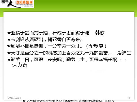 勤 勤于思考,勤于行动,勤为客户服务,国寿人必须以勤补拙,以勤补晚,最终受惠者仍将是勤劳者自己。 ★业精于勤而荒于嬉,行成于思而毁于随 -韩愈 ★宝剑锋从磨砺出,梅花香自苦寒来。 ★勤能补拙是良训,一分辛劳一分才。(华罗庚) ★天才是百分之一的灵感加上百分之九十九的勤奋。—爱迪生 ★勤劳一日,可得一夜安眠;勤劳一生,可得幸福长眠 --达·芬奇 营销员的必备素质 脑勤手勤耳勤口勤腿勤 勤能补拙 爱因斯坦小时候,是被所有人公认的一个小笨蛋,笨到同学们见到他就议论纷纷,笨到老师也觉得他无可救药了。可是呢,爱因斯坦却具有了常人所没有的意志力,那,就是“勤奋”!在手工课上,别的小朋友都交了一个个精美的手工作品,可他却交了一个工艺粗糙的的小木凳子,大家都笑话他。老师也讽刺他:“我看没有比这个更糟糕的东西了!”可是爱因斯坦却拿出了两个比这个更加糟糕的小凳子,这时,老师和同学们惊呆了,也由此改变了对他的看法。这是爱因斯坦的成长过程中一次小小的勤奋,他的收获是得到了同学和老师对他新的看法;长大了以后,爱因斯坦更加勤奋了,他的成就也就更大了——他得到了诺贝尔奖、以及许多数都数不清的奖项。瞧,这不是一个典型的勤能补拙的例子吗? 我国著名戏曲表演艺术家梅兰芳曾说过:“我是个笨拙的学艺者,没有充分的天才,全凭苦学。”其实他说的一点不假。梅兰芳年轻的时候去拜师学戏,师傅说他长着一双死鱼眼睛,灰暗、呆滞,根本不是学戏的料,不肯收留他。然而,天资欠缺不但没有使梅兰芳灰心、气馁,反而促使他变得更加勤奋了。他喂鸽子,每天仰望着天空,双眼紧跟着飞翔的鸽子,穷追不舍;他养金鱼,每天俯视水底,双眼紧跟着遨游的金鱼,寻踪觅影。经过多年的不懈努力,梅兰芳的眼睛终于变得如一汪清澈的秋水,闪闪生辉,脉脉含情。 童年的邓亚萍,因为她个子矮,手脚粗短,根本不符合体校的要求,体校的大门没能向她敞开。于是,年幼的邓亚萍跟父亲学起了乒乓球,父亲规定她每天在练完体能课后,必须还要做100个发球接球的动作。邓亚萍虽然只有七八岁,但为了能使自己的球技更加熟练,基本功更加扎实,便在自己的腿上绑上了沙袋,而且把木牌换成了铁牌。对一个孩子来说,这是多么难能可贵!这不但要使身体备受煎熬,心里方面也要承受巨大的压力。小小的她,每闪、展、腾、挪一步,都可以用举步维艰来形容!腿肿了!手掌磨破了!——这是家常便饭!但他从不叫苦,不喊累!负责训练的父亲,有时心疼得掉眼泪!付出总有回报,由于邓亚萍的执着,10岁的她便在全国少年乒乓球比赛中获得团体和单打两项冠军。 虽然从小脑子好使、悟性强,但更多的是后天的努力,从8岁开始学习,一天一天的磨练,一段一段的修饰,他今日的走红绝非一日一力之功,是下了真功夫的。 疯狂的一周! 从名不见经传到超级巨星! 我的人生中只有两条路,要么赶紧死,要么精彩地活着!----- 达人秀冠军刘伟 10岁时因触电意外失去双臂,12岁学习游泳, 14岁获得全国游泳亚军,16岁学习打字, 19岁自学钢琴,仅用一年即可弹奏出相当于手弹钢琴7级水平的钢琴曲《梦中的婚礼》。2008年,与刘德华共同为奥运喝彩,合作歌曲《天意》。2010年,摘得东方卫视第一季《中国达人秀China’s Got Talent》总冠军。2011年,登上维也纳金色大厅演奏中国名曲《梁祝》,并受邀前往英国伦敦与前首相夫人切丽布莱尔会面。首部励志电视剧《我的灿烂人生》于东方卫视播出。由其自身经历为蓝本改编的电影《最长的拥抱》已经杀青,预计将于2012年4月上映。首本自传《活着已值得庆祝》同年发行。 我们身边的勤奋者 xx的王xx(xx省的件数王) xx县的张xx(xx市的件数王)城区一营的xx 城区三营的xx …… “天”指“上天”,“道”指“规律”,“天道”即“天意”,可以引申为客观的规律;“酬”可解释为“实现志愿”,即酬答、回报,“勤”为“勤奋”。就是说“天意厚报那些勤奋的人”。所以总的意思是说:勤奋的人会得到更多的回报。上天会实现勤劳的人的志愿。有耕耘就会有收获,我们只要不懈努力,最大限度的完善充实自己,千方百计的提高自己的竞争实力,就会有一个美好光明的明天。