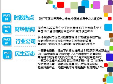 每日新闻速递 2017年6月7日 星期三 时政热点 财经新闻 行业公司 民生百态 2017年度世界竞争力报告:中国全球竞争力大幅提升 多地发布2017年企业工资指导线 你工资能涨多少? 中国10个省份城镇化率超60% 京津沪超80% 多地保监局力促防风险措施落地 严格监管保险产品 专家建议养老保险实行强有力税收递延政策 养老险公司逐步进入盈利期 未来机遇挑战并存 中国豪宅怪象:调控下价格有增无减 85后买手渐成新主力 2016年中国环境公报发布 254个城市空气质量超标 高考辅导班考前3天仍可报班 2个月冲刺账单超10万 中国高中生超八成近视 医生呼吁多到户外"目"浴阳光 探访流动儿童:受教育条件差 超八成存健康问题 起底辣条产业:问题辣条河南湖南最多 利润高达50% 时政热点 2017年度世界竞争力报告:中国全球竞争力大幅提升 2017-06-05 13:38 来源:中国经济网 根据瑞士洛桑管理学院近日发布的《2017年度世界竞争力报告》,在全球最具竞争力的经济体中,中国从2016年的第25位跃升至第18位,并且在人均国内生产总值不足2万美元的经济体中竞争力排名最高。瑞士洛桑管理学院表示,中国排名上升的主要原因在于,中国更加深入地融入全球化贸易,促使其“经济表现”“政府效率”和“营商效率”等均有明显提升。《2017年度世界竞争力报告》根据“经济表现”“政府效率”“营商效率”以及“基础建设”4项竞争力因素评估各经济体。中国在“经济表现”中高居全球第二位,在该竞争力因素下的“内部经济”和“就业”两项分指数中更是排名全球首位,从而使本年度总排名上升了7个位次。 财经新闻 多地发布2017年企业工资指导线 你工资能涨多少? 2017-06-06 07:44 来源: 中国新闻网 今年你的工资能涨多少?多地对此给出了指导性建议。中新网记者梳理发现,今年至少已有山东、山西、内蒙古等地发布了2017年企业工资指导线,为企业给职工调整工资提供了参考依据。山西省人社厅近日发布2017年企业工资指导线,其中,2017年山西省企业货币工资增长基准线为8%,增长上线为12%,增长下线为4%。