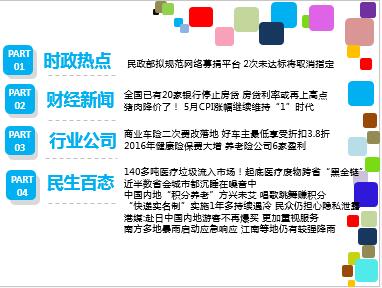 每日新闻速递 2017年6月12日 星期一 时政热点 财经新闻 行业公司 民生百态 民政部拟规范网络募捐平台 2次未达标将取消指定 全国已有20家银行停止房贷 房贷利率或再上高点 猪肉降价了! 5月CPI涨幅继续维持“1”时代 商业车险二次费改落地 好车主最低享受折扣3.8折 2016年健康险保费大增 养老险公司6家盈利 140多吨医疗垃圾流入市场!起底医疗废物跨省“黑金链” 近半数省会城市都沉睡在噪音中 中国内地“积分养老”方兴未艾 唱歌跳舞赚积分 “快递实名制”实施1年多持续遇冷 民众仍担心隐私泄露 港媒:赴日中国内地游客不再爆买 更加重视服务 南方多地暴雨启动应急响应 江南等地仍有较强降雨 时政热点 民政部拟规范网络募捐平台 2次未达标将取消指定 2017-06-10 11:30 来源:澎湃新闻 近日,民政部社会组织管理局起草了慈善组织互联网公开募捐信息平台《基本技术规范》《基本管理规范》两项行业标准,并面向社会公开征求意见,截止日期为6月9日。两项行业标准对网络募捐提出了更为详细的要求,明确网络募捐平台申报和退出机制、平台不得截留或代为接受捐赠资金、慈善组织需提供多项资质等。《慈善组织互联网公开募捐信息平台基本管理规范》(以下简称《基本管理规范》)规定了慈善组织互联网公开募捐信息平台(以下简称平台)在指定、运行、服务、监管等层面的基本管理要求。 财经新闻 全国已有20家银行停止房贷 房贷利率或再上高点 2017-06-10 10:31 来源: 证券日报 近来,北上广深等一线城市纷纷上调首套房房贷利率,而且也有二、三线城市不断跟进。融360监测数据显示,5月份全国首套房房贷平均利率为4.73%,环比上月上升4.64%。同比去年5月份的4.45%,上升6.29%。在融360监测的35个城市首套房房贷平均利率中,最低的为大连4.43%,最高的为石家庄4.99%。具体来看,此次调整由一线城市领跑,其中又以北京为最,最先调整至9.5折水平,最先调整至基准水平,未来或会成为最先调整至基准上浮10%水平。一线城市对市场变化极为敏感,同时针对变化调整也极为迅速,成为市场风向标,大体可以反映出未来市场变化趋势。