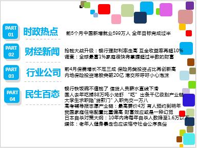 每日新闻速递 2017年6月16日 星期五 时政热点 财经新闻 行业公司 民生百态 前5个月中国新增就业599万人 全年目标完成过半 抢钱大战升级:银行理财利率走高 互金收益率再超10% 调查:全球最富1%家庭很快将掌握超过半数的财富 前4月保费增长不足三成 保险另类投资占比再创新高 内地保险投资港股突破20亿 港交所呼吁小心泡沫 银行铁饭碗不值钱了 信贷人员薪水直线下滑 国人去年吃掉88万吨小龙虾 “吃”出条千亿级别产业链 大学生求职陷"贷款门" 入职先交一万八 高考辅导报志愿产业链:最高要价4万 有人预约到明年 我国家庭住宅配置比重偏高 财富效应或是一种幻觉 日本自杀对策大纲:10年内将每年自杀人数降至1.6万以下 媒体:老年人健身暴走也应该恪守社会公序良俗 时政热点 前5个月中国新增就业599万人 全年目标完成过半 2017-06-15 07:07:00 来源:中新社 中国国家统计局新闻发言人刘爱华14日在京透露,今年前5个月,中国城镇新增就业实现599万人,比去年同期增长了22万人。与年初政府工作报告制定的1100万的目标相比,已经完成了54.4%。就业稳定还体现在失业率水平稳定上。刘爱华指出,从国家统计局统计的全国城镇调查失业率和31个大城市的城镇调查失业率这两个指标来看,5月份都在5%以下。总体来说,就业保持了持续向好的态势。 财经新闻 抢钱大战升级:银行理财利率走高 互金收益率再超10% 2017-06-15 07:02 来源:经济参考报 “往年都是年底市场利率最高,今年年中的利率就已经超过了去年年底。当前资金面延续紧张态势,机构都在‘抢钱’,理财产品收益率还有不断升高的迹象。”一位国有大行理财经理告诉《经济参考报》记者。近日,记者走访北京多家银行发现,年化预期收益率在6%以上的理财产品为数不少,四大行的部分理财产品预期收益率也超过了5%。据了解,一款东亚银行(中国)理财产品预期年化收益率甚至高达7%。