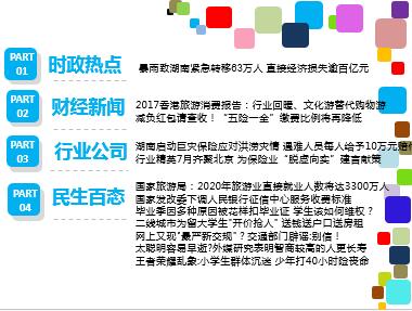 每日新闻速递 2017年7月4日 星期二 时政热点 财经新闻 行业公司 民生百态 暴雨致湖南紧急转移63万人 直接经济损失逾百亿元 2017香港旅游消费报告:行业回暖、文化游替代购物游 减负红包请查收!“五险一金”缴费比例将再降低 湖南启动巨灾保险应对洪涝灾情 遇难人员每人给予10万元赔付 行业精英7月齐聚北京 为保险业“脱虚向实”建言献策 国家旅游局:2020年旅游业直接就业人数将达3300万人 国家发改委下调人民银行征信中心服务收费标准 毕业季因多种原因被花样扣毕业证 学生该如何维权? 二线城市为留大学生"开价抢人" 送钱送户口送房租 网上又现"最严新交规"?交通部门辟谣:别信! 太聪明容易早逝?外媒研究表明智商较高的人更长寿 王者荣耀乱象:小学生群体沉迷 少年打40小时险丧命 时政热点 暴雨致湖南紧急转移63万人 直接经济损失逾百亿元 2017-07-03 07:11:26 来源:中国新闻网 境内江河湖泊水位暴涨,大多数河流超警戒、历史最高水位;各地灾情频现,受灾范围不断扩大;省级Ⅱ级救灾应急响应、地质灾害监测预警Ⅱ级响应相继拉响……连日强降雨致湖南遭受严重洪涝灾害,共紧急转移63.38万人。湖南省委书记、省人大常委会主任杜家毫2日表示,要把防汛抗灾作为当前压倒一切的重大任务,以最高的标准、最硬的举措全力迎战此次超历史最高水位洪水。6月以来,大范围的暴雨袭击三湘大地。据湖南省气候中心统计,当月该省平均降雨量破历史极值,位居1951年有气象记录以来历史同期第一高位,其中6月22日以来的当月最强降雨过程仍在持续,强度指数为历史第一高值。 财经新闻 2017香港旅游消费报告:行业回暖、文化游替代购物游 2017-07-03 07:50 来源:第一财经网 香港回归祖国20周年,香港旅游发展局统计数据显示,自1997年回归以来,历经了旅游行业的20年飞跃式成长,内地访港人次从1997年的236万攀升至2016年超过4277万,增长超过18倍。驴妈妈、途牛等业者发布“2017香港旅游消费报告” (下称“报告”)显示,内地游客今年上半年赴港游人次是去年同期的3倍,赴港游回暖趋势明显。值得注意的是,赴港购物游已经不再是内地游客的首选,越来越多的游客愿意放慢脚步,开始享受香港的美景和人文风情。