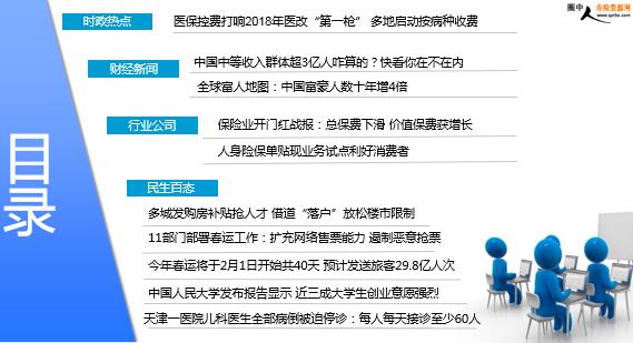2017年1月10日 星期三 每日新闻速递 目录 时政热点 财经新闻 行业公司 民生百态 医保控费打响2018年医改“第一枪” 多地启动按病种收费 中国中等收入群体超3亿人咋算的?快看你在不在内 全球富人地图:中国富豪人数十年增4倍 保险业开门红战报:总保费下滑 价值保费获增长 人身险保单贴现业务试点利好消费者 多城发购房补贴抢人才 借道“落户”放松楼市限制 11部门部署春运工作:扩充网络售票能力 遏制恶意抢票 今年春运将于2月1日开始共40天 预计发送旅客29.8亿人次 中国人民大学发布报告显示 近三成大学生创业意愿强烈 我国去年完成快递四百亿件 连续四年稳居世界第一 天津一医院儿科医生全部病倒被迫停诊:每人每天接诊至少60人 时政热点 2018-01-09 04:35 来源:经济参考报 作为医改重头戏之一,医保控费开始打响2018年医改“第一枪”。近日广西、浙江、四川、河南等多个省份密集发布扩大按病种收付费范围的通知。据记者不完全统计,全国近三分之二省份已经实施或正试点实施按病种收费。业内人士表示,这一变化意味着我国医改正迈出实质性一步。按病种收费,即从患者入院,按病种治疗管理流程接受规范化诊疗,达到临床疗效标准后出院,整个过程中发生的诊断、治疗、手术等各项费用,都一次性打包收费。医院按此标准收费,医保基金和参保患者按规定比例付费。 财经新闻 全球富人地图:中国富豪人数十年增4倍 2018-01-09 08:44:44 来源:证券时报 2016年,我国居民人均可支配收入23821元,比2012年增长了44.3%,实际年均增长7.4%。这意味着,随着我国经济持续较快增长,特别是经济运行质量不断提升,将有越来越多的人加入到中等收入群体行列。超过3亿人的中等收入人群,所释放的消费需求将是中国经济增长最大的稳定器,而中等收入群体人力资本的快速积累,将更好为创新型国家的建设提供重要支撑,是中国从高速增长阶段步入高质量发展阶段最坚实的基础。