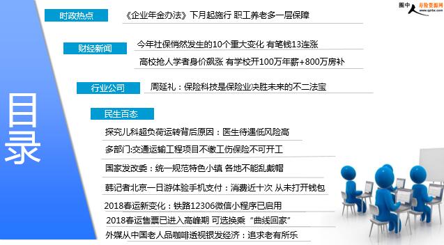 2017年1月17日 星期一 每日新闻速递 目录 时政热点 财经新闻 行业公司 民生百态 《企业年金办法》下月起施行 职工养老多一层保障 今年社保悄然发生的10个重大变化 有笔钱13连涨 高校抢人学者身价飙涨 有学校开100万年薪+800万房补 周延礼:保险科技是保险业决胜未来的不二法宝 探究儿科超负荷运转背后原因:医生待遇低风险高 多部门:交通运输工程项目不缴工伤保险不可开工 国家发改委:统一规范特色小镇 各地不能乱戴帽 韩记者北京一日游体验手机支付:消费近十次 从未打开钱包 2018春运新变化:铁路12306微信小程序已启用 2018春运售票已进入高峰期 可选换乘“曲线回家” 外媒从中国老人品咖啡透视银发经济:追求老有所乐 时政热点 《企业年金办法》下月起施行 职工养老多一层保障 2018-01-11 01:14 来源:央视财经 人社部有关负责人介绍,企业年金是企业及其职工在依法参加基本养老保险的基础上,通过集体协商自主建立的补充养老保险制度,是我国多层次养老保险制度体系中第二支柱的重要组成部分。职工参加企业年金,有利于在基本养老保险的基础上,另外增加一份养老积累,进一步提高退休后的收入水平。经过多年的改革发展,企业职工基本养老保险已覆盖城镇各类企业及其职工、社会组织及其专职工作人员、机关事业单位编制外工作人员等。依据《办法》,参加了企业职工基本养老保险的用人单位及其职工,都可以建立企业年金制度。 财经新闻 今年社保悄然发生的10个重大变化 有笔钱13连涨 2018-01-14 07:18 来源:人民日报 1、到2017年底,退休人员的基本基本养老金总体上调了5.5%左右,实现了该项补贴的13连涨。 2、1800亿的养老保险基金已经进行了投资运营,后续进一步的投资将稳步开展。 3、不同地区的医疗保险就医结算已经全国联网,我们在外地报销医疗保险不用再来回奔波了。 4、国家通过相关条文,已经明确规定了企业国有股权的10%逐步划拨到社保基金。 5、统一了养老保险个人账户的利息不能低于银行定期利息,这样做就打消了大家担心交社保获取的利息比不上银行利息的顾虑。 6、今年,有12个城市启动了生育保险和职工基本医疗保险合并的试点工作,这样做变相提高了部分地区的生育保险的报销比例,生二胎更加有底气了。 7、降低了失业保险费率、提高了失业金标准。 8、企业员工可以申请技能提升补贴了,初步估计每年会有200万人收到益处,从而减少我们进行再教育的投入压力。 9、失业人员也会有养老、医疗保险了,这部份在11月份已经开始向社会征求意见。 10、工伤保险待遇有了明确的调整次数规定,要求至少每年调整一次,这样保障了参保人员在遇到工伤事故时能获得与当时社会生活水平相匹配的补贴金额。