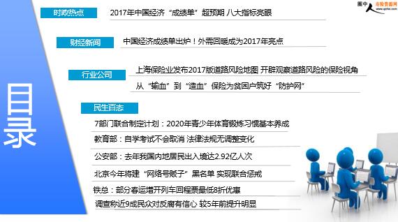 2017年1月20日 星期六 每日新闻速递 目录 时政热点 财经新闻 行业公司 民生百态 2017年中国经济“成绩单”超预期 八大指标亮眼 中国经济成绩单出炉!外需回暖成为2017年亮点 上海保险业发布2017版道路风险地图 开辟观察道路风险的保险视角 从“输血”到“造血”保险为贫困户筑好“防护网” 7部门联合制定计划:2020年青少年体育锻炼习惯基本养成 教育部:自学考试不会取消 法律法规无调整变化 公安部:去年我国内地居民出入境达2.92亿人次 北京今年将建“网络号贩子”黑名单 实现联合惩戒 铁总:部分春运增开列车回程票最低8折优惠 调查称近9成民众对反腐有信心 较5年前提升明显 时政热点 2017年中国经济“成绩单”超预期 八大指标亮眼 2018-01-19 10:31:43 来源:中国新闻网 2017年中国经济“成绩单”今日出炉,一系列指标尤为亮眼:GDP增速实现企稳回升;GDP总量首次突破80万亿元;就业目标超额完成;居民收入增速大幅跑赢GDP增速;企业效益明显好转;进出口扭转连续两年下降的局面;物价涨幅重返“1时代”;经济结构继续优化。 1、GDP增速企稳回升超预期2、GDP总量首次突破80万亿元3、全年就业目标超额完成4、居民收入增速跑赢GDP增速5、企业效益明显好转6、进出口扭转连续两年下降局面7、全年物价涨幅重返“1时代”8、经济转型升级取得新成效 财经新闻 中国经济成绩单出炉!外需回暖成为2017年亮点 2018年01月19日 10:08:40 来源:新华社 1月19日《经济参考报》刊发题为《外需改善引领经济超预期运行》的报道。文章称,国家统计局18日发布数据,2017年我国国内生产总值(GDP)827122亿元,比上年增长6.9%,实现2011年以来的首次回升。国家统计局局长宁吉喆表示,从数据上看,四大宏观指标均稳中向好:2017年GDP实际增长6.9%,城镇新增就业人数超过1300万;12月末城镇调查失业率低于5%;全年居民消费价格指数(CPI)上涨1.6%,这些数据均好于预期。可以说,中国经济活力、动力和潜力不断释放,稳定性、协调性和可持续性明显增强。