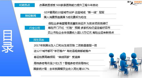 2017年1月23日 星期二 每日新闻速递 目录 时政热点 财经新闻 行业公司 民生百态 改善就医感受 500家县医院能力提升工程今年启动 GDP最高的10座城市出炉 这座城成“新一线”冠军 国人消费预追美国 5成花费却为吃住 保险业多维度精准浇灌实体经济 为实体项目亮绿灯 寿险开门不红“打脸”预期 多家机构仍坚定看好后市 四上市险企去年保费收入超1.5万亿元 寿险业迎来新拐点 2017年我国出生人口和出生率双降 二孩数量首超一孩 这12个城市都可"学历落户" 有的连租房都能落户 春运抢票高峰频现 “曲线回家”受追捧 高档养老每月至少花1万?警惕养老项目高档化 国家统计局:去年我国餐饮业收入同比增10.7% 时政热点 改善就医感受 500家县医院能力提升工程今年启动 2018-01-22 03:59:00 来源:中国新闻网 “目前,流感病人主要集中在大医院就诊,有些病人反映这主要是因为基层医疗机构有不收治流感病人、发热病人的惯例。”近日,在国家卫计委2018年第一场例行发布会上,针对近期来势汹汹的流感,有记者向医政医管局副局长焦雅辉抛出了这个犀利问题,“如何发挥基层医疗机构的作用?”“2005年我们就有了医疗机构预检分诊管理办法,目的是及时发现重特大传染病病人,收治到有救治条件的医院。”焦雅辉回答,“我们会把这项政策在全国提出明确要求,让基层能够承担绝大多数常见病、多发病诊疗任务。现在,不管是通过对口支援、对口帮扶,还是医联体,都是要让这些资源下沉,提升基层诊疗服务能力。” 财经新闻 GDP最高的10座城市出炉 这座城成“新一线”冠军 2018-01-22 07:07 来源:每日新闻网 最近几天,北上广深等一线城市,天津、成都、武汉、苏州等“新一线”城市陆续公布2017年经济数据,中国前10强城市的排名也逐渐清晰。其中,上海GDP总量首次突破3万亿,在全国城市中稳居第一位。北京、深圳、广州成为“2万亿俱乐部”成员,这四座城市的经济总量破10万亿元,占全国GDP总量1/8。