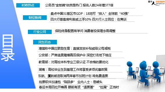 2017年1月31日 星期三 每日新闻速递 目录 时政热点 财经新闻 行业公司 民生百态 公务员"金饭碗"依然是热门 报名人数24年增377倍 盘点中国31省区市GDP:18地可“排入”全球前“40强” 四大行首套房利率或上浮10% 四大行人士回应:在商谈 保险终身配置有学问 消费者投保理念需调整 港媒称中国应鼓励生育:直接发放补贴或给父母减税 公安部:严肃追责赌博幕后保护伞 深挖打击地下钱庄 教育部:对高校本科专业三级认证 不合格的要优化 湖南:高校毕业生到基层工作将享受多项优惠政策 东航、厦航被迫取消两岸春节加班计划 将免费退票 抢票软件加速包“陷阱多” 业内人士:是噱头 春运本周四拉开帷幕 眼前有波“退票潮” “捡漏”正当时 时政热点 公务员"金饭碗"依然是热门 报名人数24年增377倍 2018-01-30 11:25:08 来源:中国经济周刊 每年的国考由中组部、人社部、国家公务员局组织,为中央、国家机关及其直属机构招录公务员,招录对象面向全国。据国家公务员局统计,2018年“国考”共有120多个中央机关及其直属机构和参照公务员法管理的单位参加,计划招录2.8万余人,最终有165.97万人通过报名资格审查,较去年增加了17.34万,通过资格审查人数与录用计划人数之比为59比1。这些数据与20多年前首次进行的公务员招录考试差距很大。我国正式建立公务员考试录用制度始于1994年,原人事部组织了首届中央国家行政机关公务员录用招考。统计显示,当年的国考提供了30余个国家机关共490个招录名额,最终4400人正式报考,相当于9个人争考一个职位。 财经新闻 2018-01-30 11:12 来源:中国新闻网 盘点中国31省区市GDP:18地可“排入”全球前“40强” 如果让中国内地31省区市参加以国家为单位的全球经济排名,那么18地将排入全球“40强”。在中国2017年国家层面的各项经济数据公布后,各省区市也陆续揭晓了本地2017经济“成绩单”。在经济总量方面,广东、江苏、山东、浙江、河南、四川、湖北、河北、湖南、福建和上海11地的GDP总量突破3万亿元(人民币,下同)关口,均超过2.5万亿元这一全球榜单中前30强的“分割线”。其中,广东2017年GDP总量接近8.99万亿元,在连续29年居31省区市首位的同时,在全球榜单上也与排名第14位的西班牙“比肩”。紧随广东之后的是8.59万亿的江苏与7.26万亿的山东。
