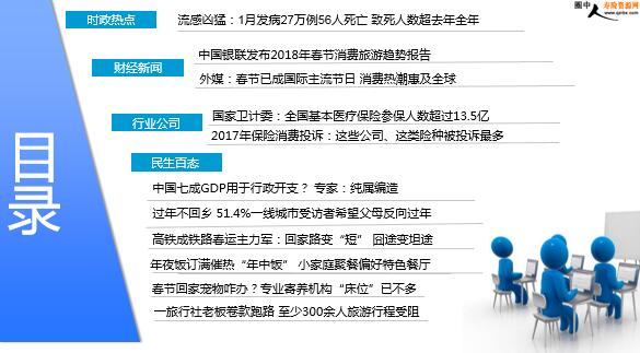 每日新闻速递 2017年2月14日 星期三 目录 时政热点 财经新闻 行业公司 民生百态 流感凶猛:1月发病27万例56人死亡 致死人数超去年全年 中国银联发布2018年春节消费旅游趋势报告 外媒:春节已成国际主流节日 消费热潮惠及全球 国家卫计委:全国基本医疗保险参保人数超过13.5亿 2017年保险消费投诉:这些公司、这类险种被投诉最多 中国七成GDP用于行政开支? 专家:纯属编造 过年不回乡 51.4%一线城市受访者希望父母反向过年 高铁成铁路春运主力军:回家路变“短” 囧途变坦途 年夜饭订满催热“年中饭” 小家庭聚餐偏好特色餐厅 春节回家宠物咋办?专业寄养机构“床位”已不多 一旅行社老板卷款跑路 至少300余人旅游行程受阻 时政热点 流感凶猛:1月发病27万例56人死亡 致死人数超去年全年 2018-02-13 10:59 来源:国际在线 近日,刷屏的微信公众号文章《流感下的北京中年》讲述了今年1月份一个东北老人29天从患流感到死亡的全过程,引无数人唏嘘澎湃新闻查阅了2018年1月的数据,全国流行性感冒共录得发病数273949例,死亡56人,而2016年、2017年全年流行性感冒死亡数分别是56人、38人(逐月累加)。上述数据来源于国家卫计委2月12日在其官网发布的2018年1月全国法定传染病疫情概况,其中,归属于丙类传染病的流行性感冒共录得发病数273949例,死亡56人。流感死亡人数是去年同期(2017年1月死亡6人)的9.3倍、是上月(2017年12月死亡5人)的11.2倍。 财经新闻 中国银联发布2018年春节消费旅游趋势报告 2018-02-12 15:05 来源: 中国新闻网 春节不仅是我们中国的传统佳节,更是国内消费高峰期;随着国民收入水平的大幅提升和消费理念的全面升级,人们在家人团聚的同时,对衣、食、购等消费方面热度持续高涨。央视新闻频道通过中国银联大数据,为人们“数”说2018新年新趋势。近年来,在以供给侧结构性改革为主线,推动结构优化、动力转换和质量提升的大环境下,我国经济发展步入新常态,国民经济稳中向好。在经济活力、动力和潜力不断释放中,经济实力再上新台阶。2017年,我国国内生产总值比上年增长6.9%,全年社会消费品零售总额比上年增长10.2%,银联网络总体交易金额比上年增长28.8%,消费升级态势明显。