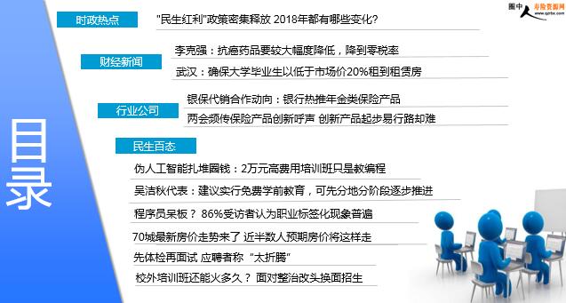 2017年3月21日 星期三 每日新闻速递 目录 时政热点 财经新闻 行业公司 民生百态 "民生红利"政策密集释放 2018年都有哪些变化? 李克强:抗癌药品要较大幅度降低,降到零税率 武汉:确保大学毕业生以低于市场价20%租到租赁房 银保代销合作动向:银行热推年金类保险产品 两会频传保险产品创新呼声 创新产品起步易行路却难 伪人工智能扎堆圈钱:2万元高费用培训班只是教编程 吴洁秋代表:建议实行免费学前教育,可先分地分阶段逐步推进 程序员呆板? 86%受访者认为职业标签化现象普遍 70城最新房价走势来了 近半数人预期房价将这样走 先体检再面试 应聘者称“太折腾” 校外培训班还能火多久? 面对整治改头换面招生 时政热点 "民生红利"政策密集释放 2018年都有哪些变化? 2018-03-20 07:41 来源:中国青年报 1、贫困群众:人数将大幅减少,获得财政更大力度支持 2、科技工作者:有机会得到更多薪酬,获得更灵活奖励 3、企业家:投资经营安心放心 4、农民:增收得实惠,环境更优美 5、老年人:养老方式更趋多样化 6、年轻人:就业创业会获得更多支持 7、患者:看病难看病贵压力将减小 8、退役军人:将得到更好的保障和服务 9、中小学生:课业负担有望减轻 10、消费者:上网、海淘、旅游花钱将更少 财经新闻 李克强:抗癌药品要较大幅度降低,降到零税率 2018-03-20 11:03 来源:澎湃新闻 新的变化意味着进一步扩大开放,我们在开放方面还有较大的空间和潜力。比如货物贸易,我们进口商品的税率水平在世界是处于中等水平,但是我们愿意以更开放的姿态继续进一步降低进口商品的总体税率水平。一些市场热销的消费品,包括药品,特别是群众、患者急需的抗癌药品,我们要较大幅度地降低进口税率,对抗癌药品力争降到零税率。对于服务贸易,我们现在可以说是逆差,进一步开放服务业会付出一些代价,但可以促进提高我们产业的竞争力。下一步重点要放宽服务业的准入,比如说在养老、医疗、教育、金融等领域,我们会加大放宽准入力度,在一些方面逐步放宽甚至取消股比的限制。我们还会全面放开制造业,在这方面不允许强制转让技术,我们将保护知识产权。 ...........